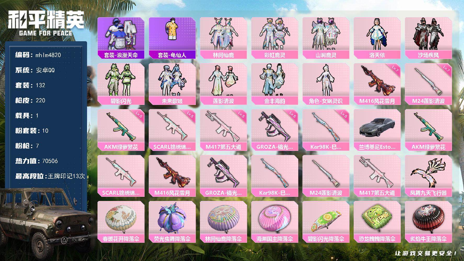 10粉装-7特效枪-1载具-1粉色飞行器-70506热力值-13王牌印记-132套装-220枪皮
