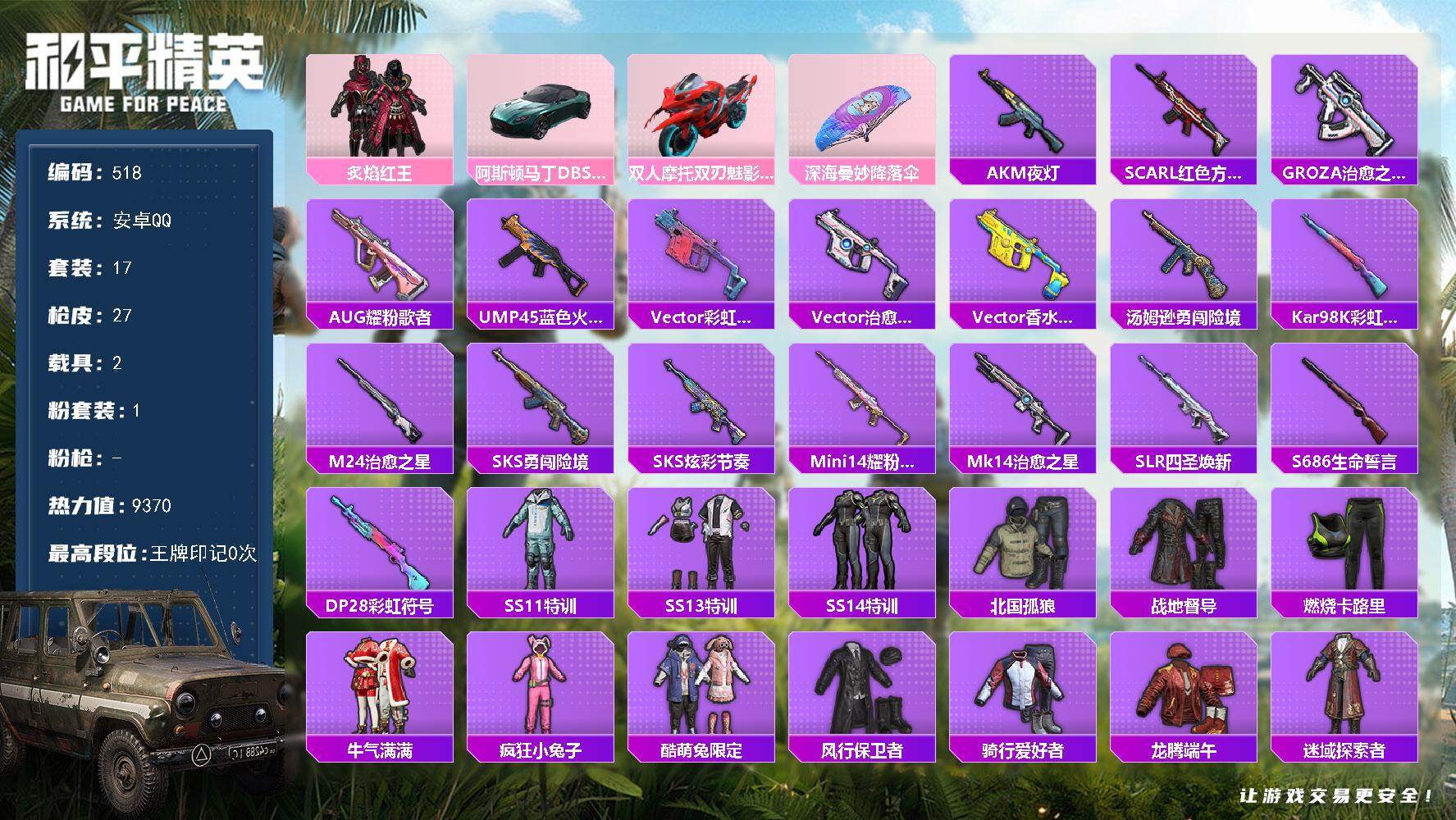 安卓 手Q-1粉装-0特效枪-2载具-0粉色飞行器-9370热力值-0王牌印记