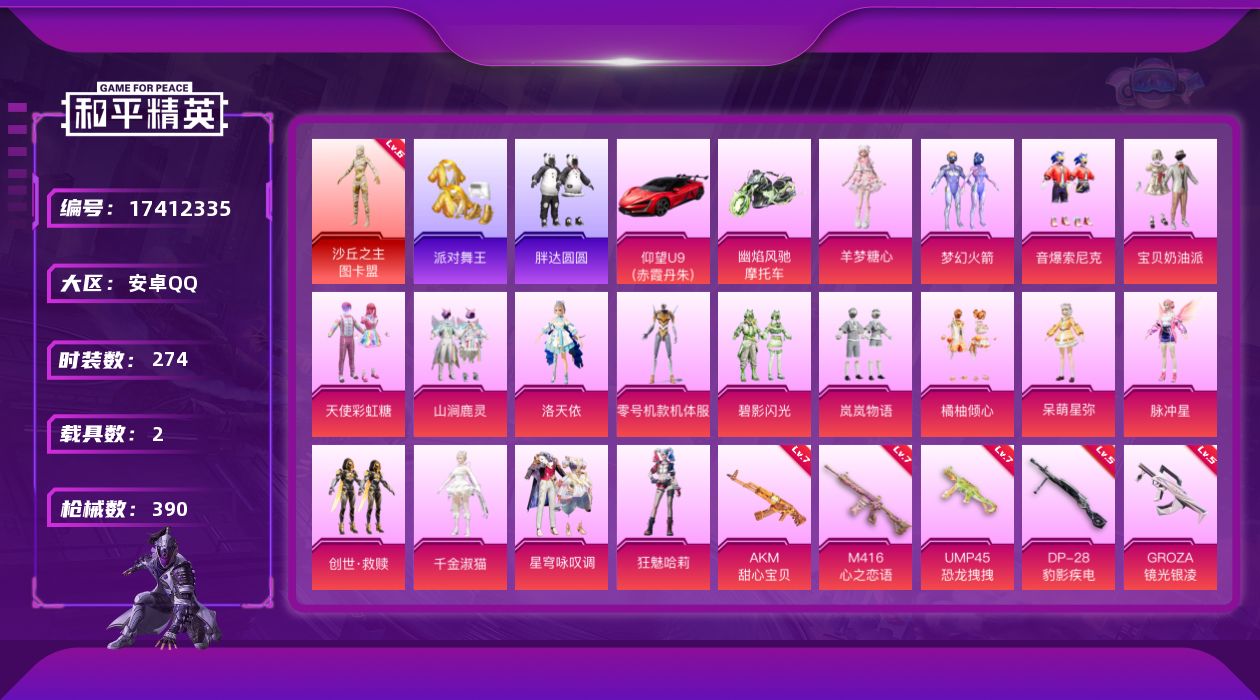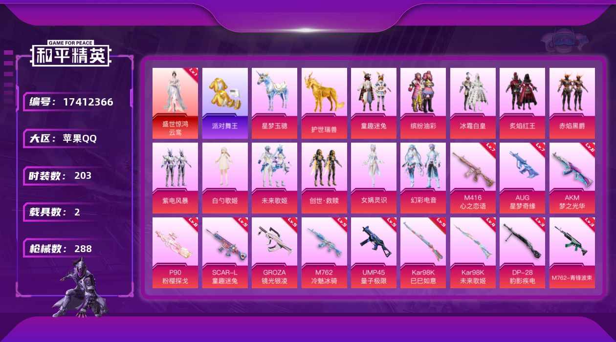 无敌战神框-1神装-11粉装-18特效枪-2载具-4粉色飞行器-94162热力值-18王牌印记-203套装-288枪皮