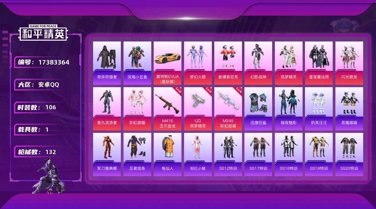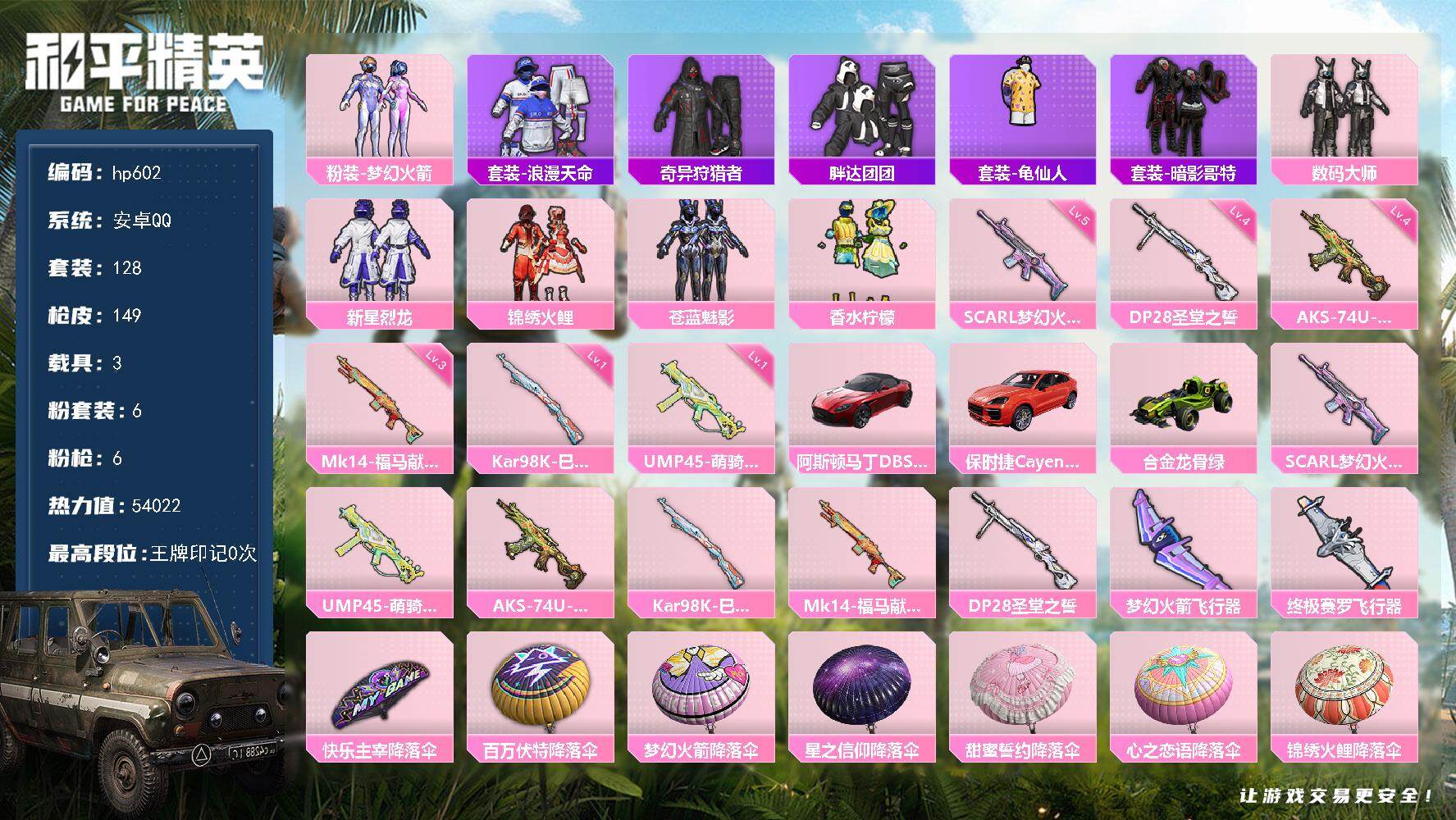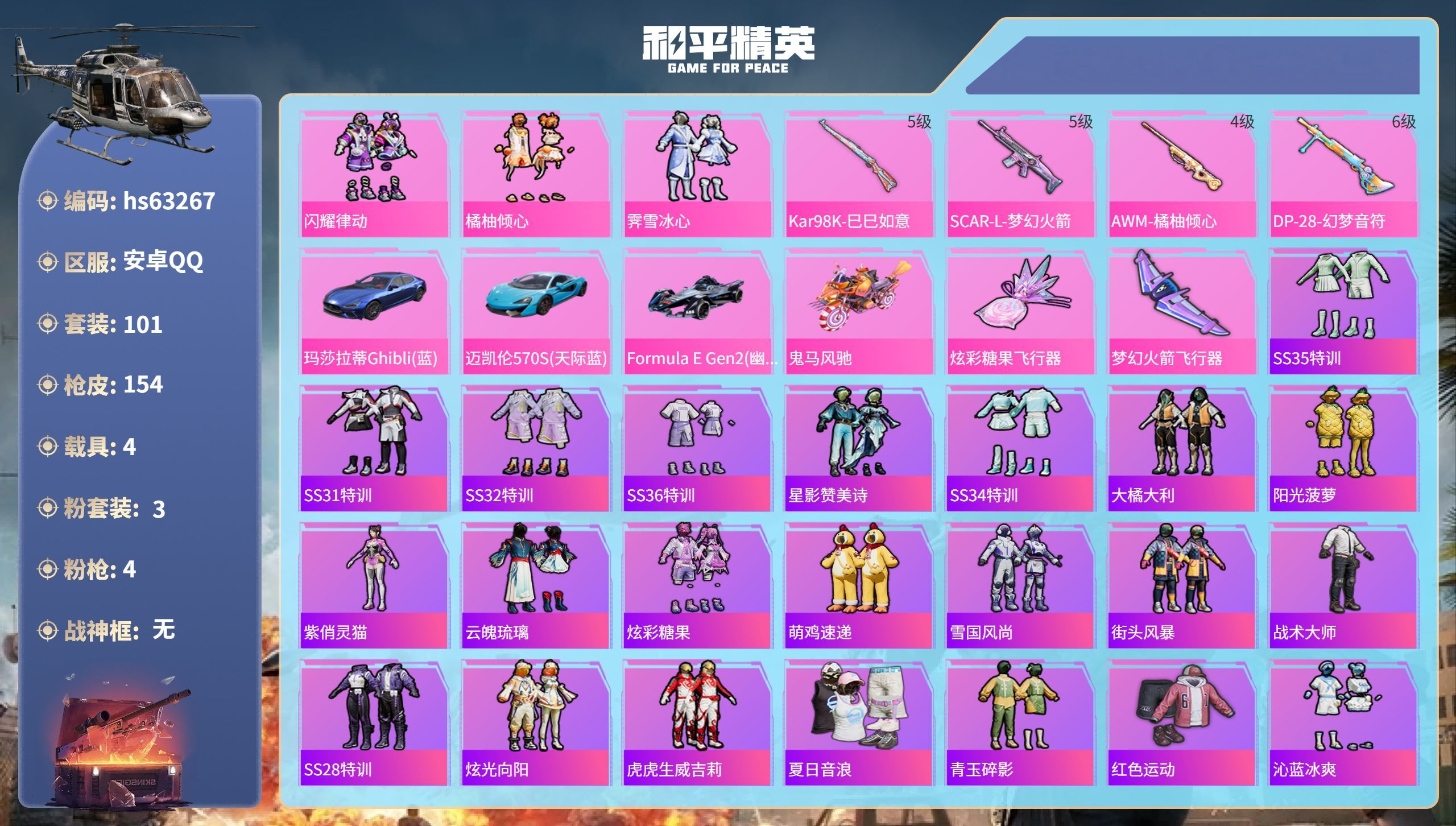 hs63354 安卓手Q-6王牌印记-3粉装-6特效枪-2载具-47318热力值-109套装-158