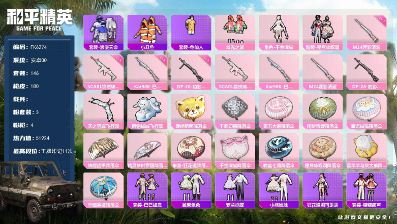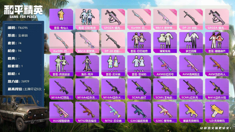 hs63267 安卓手Q-10王牌印记-3粉装-4特效枪-4载具-50610热力值-101套装-15