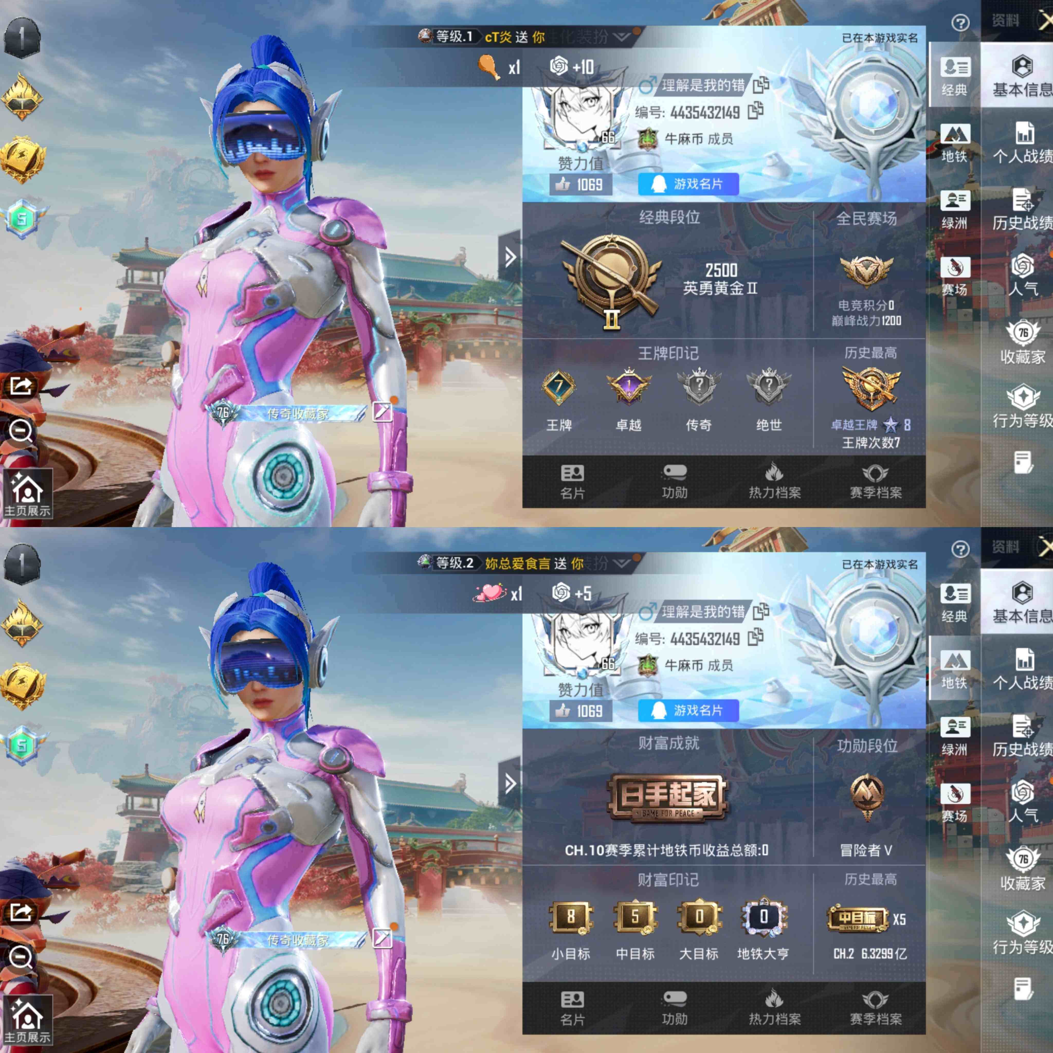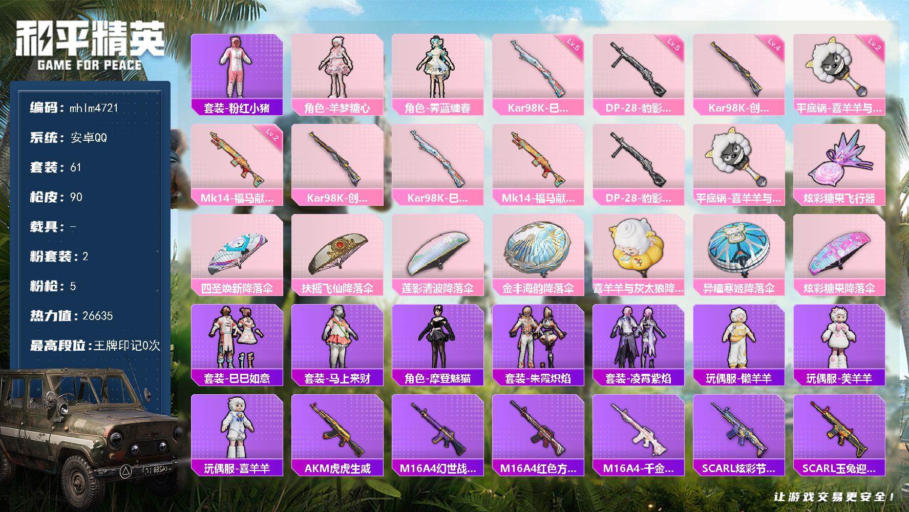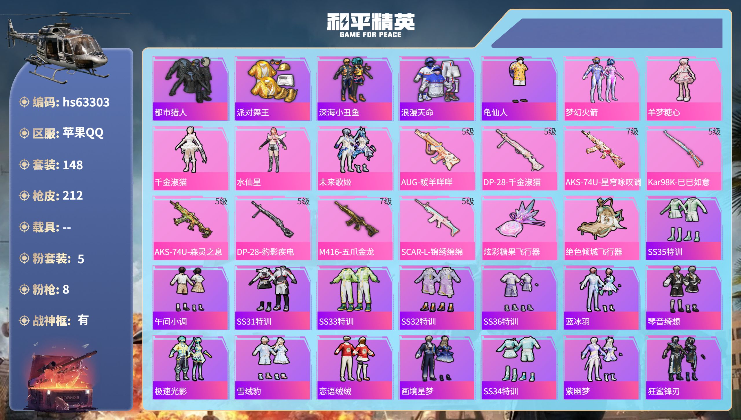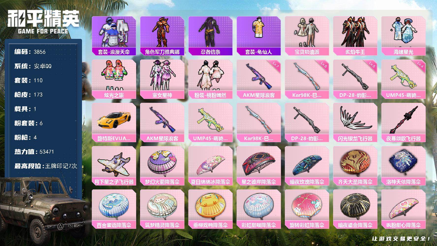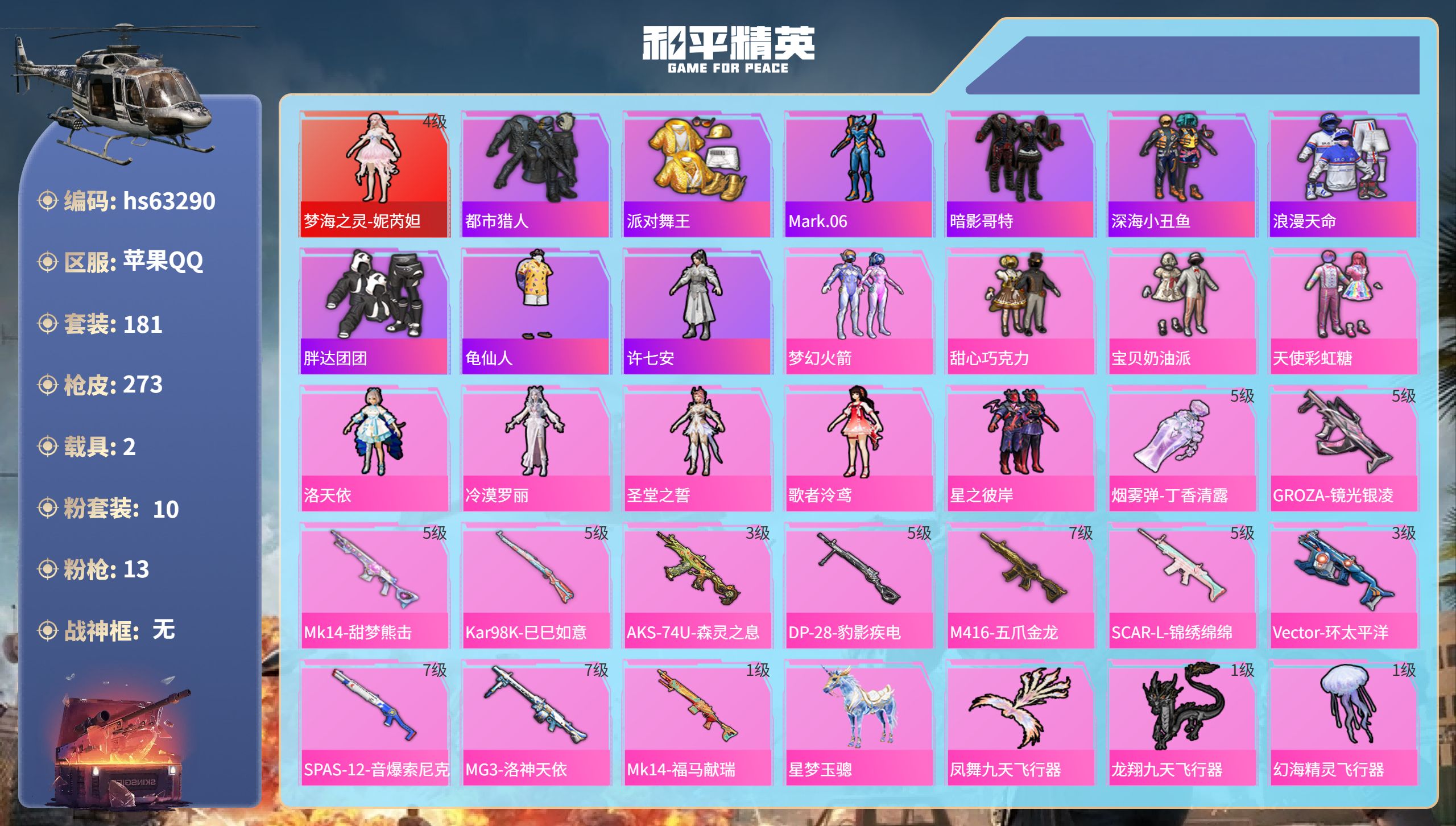 6粉装-7特效枪-0载具-4粉色飞行器-48383热力值-6王牌印记-127套装-160枪皮
