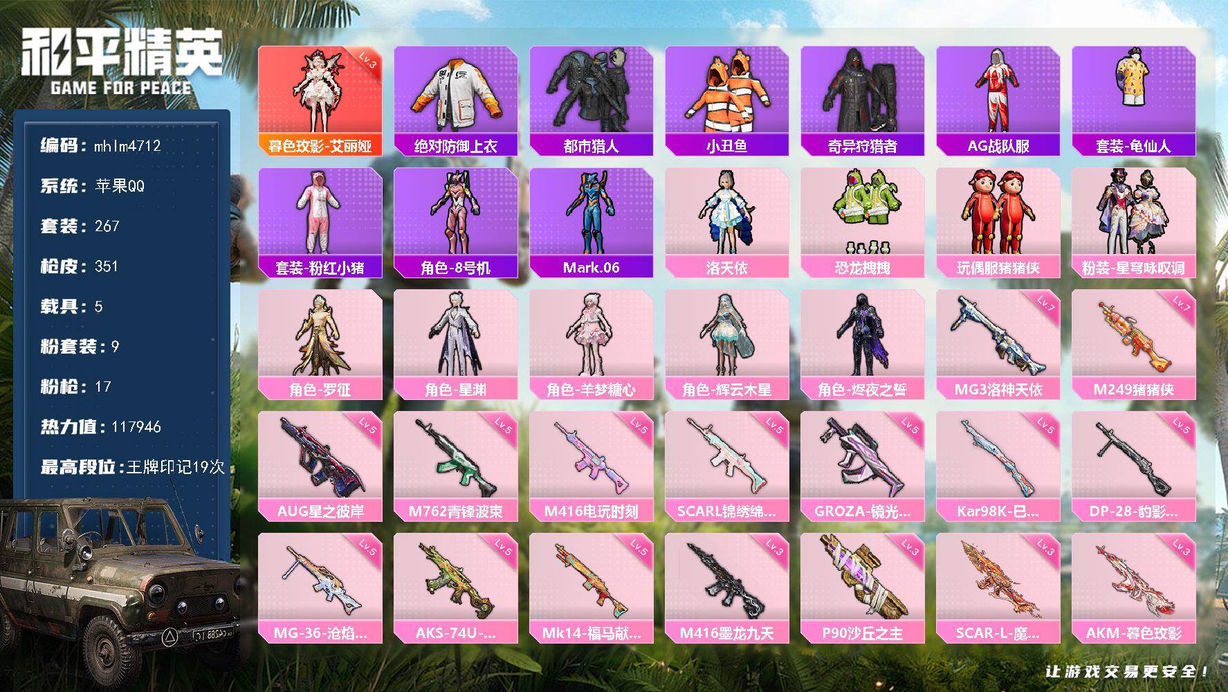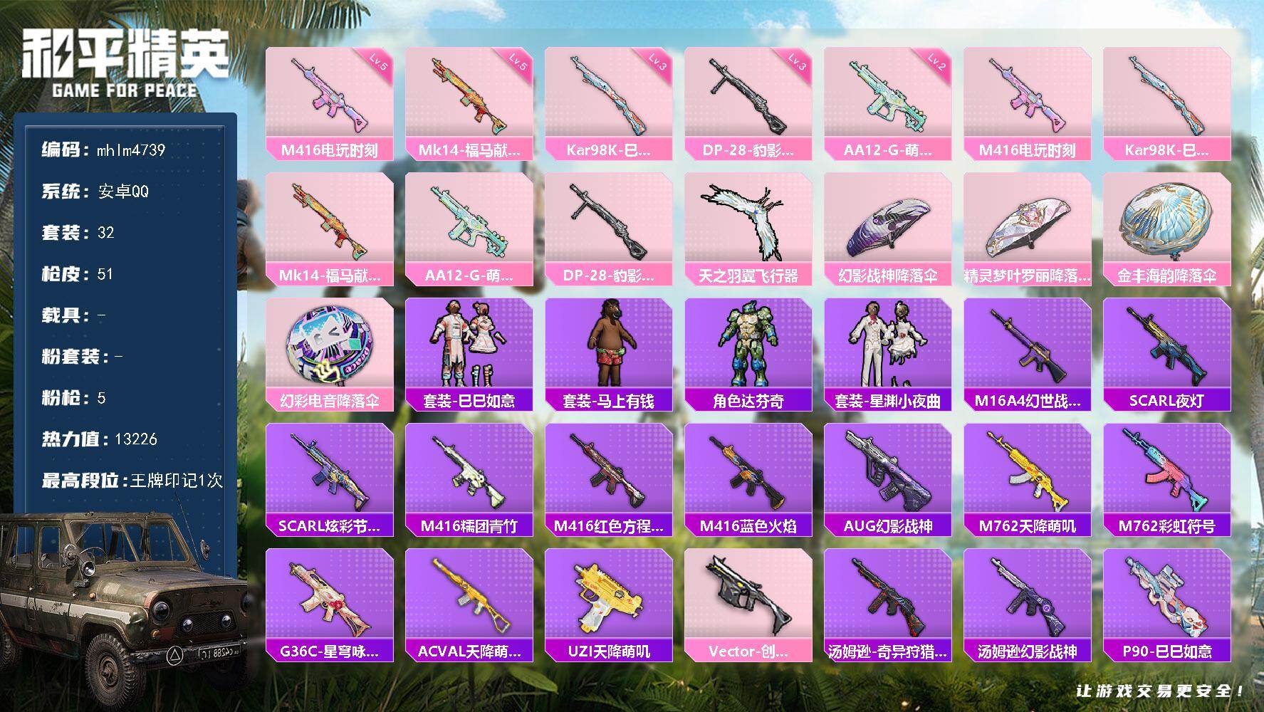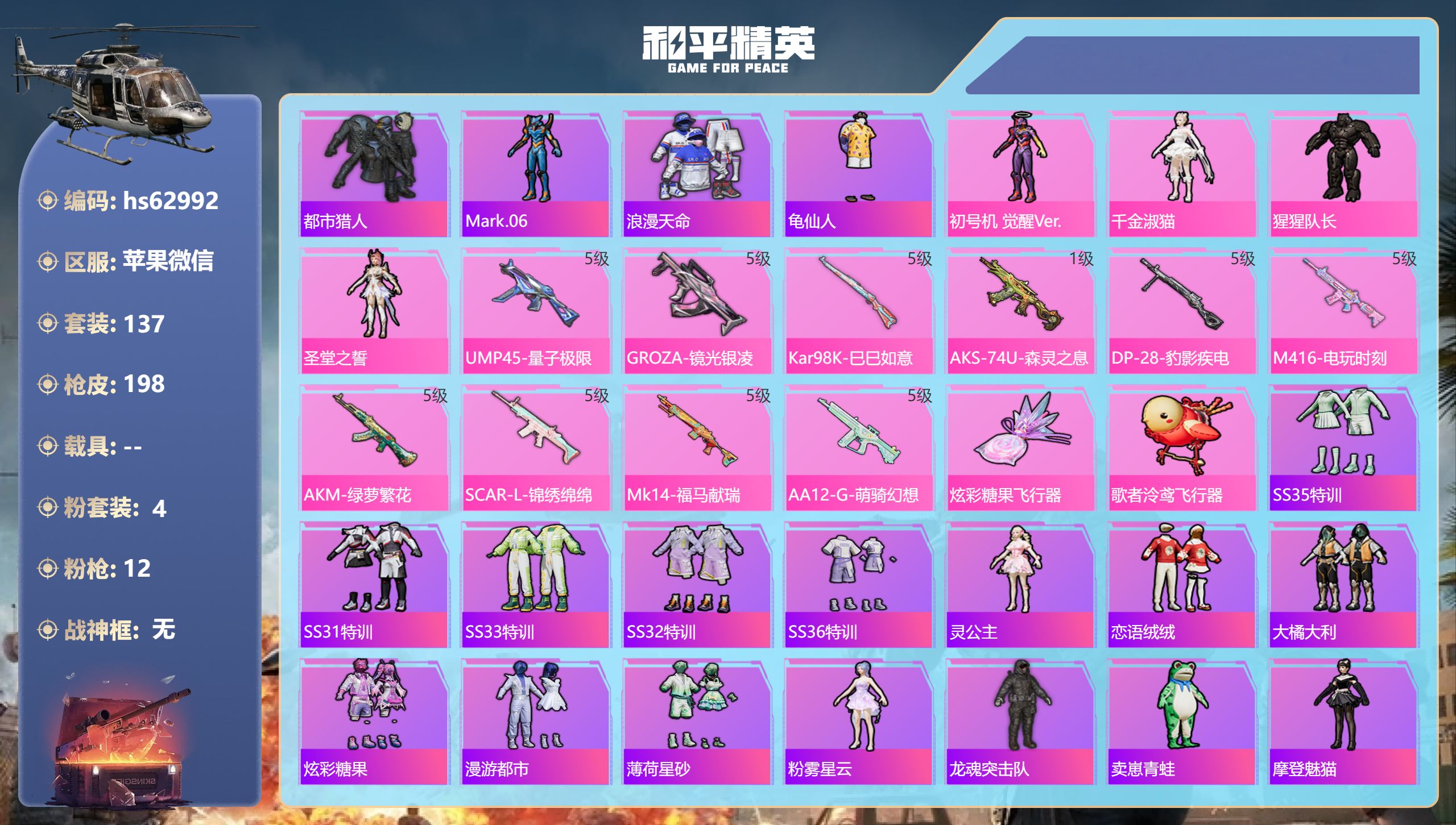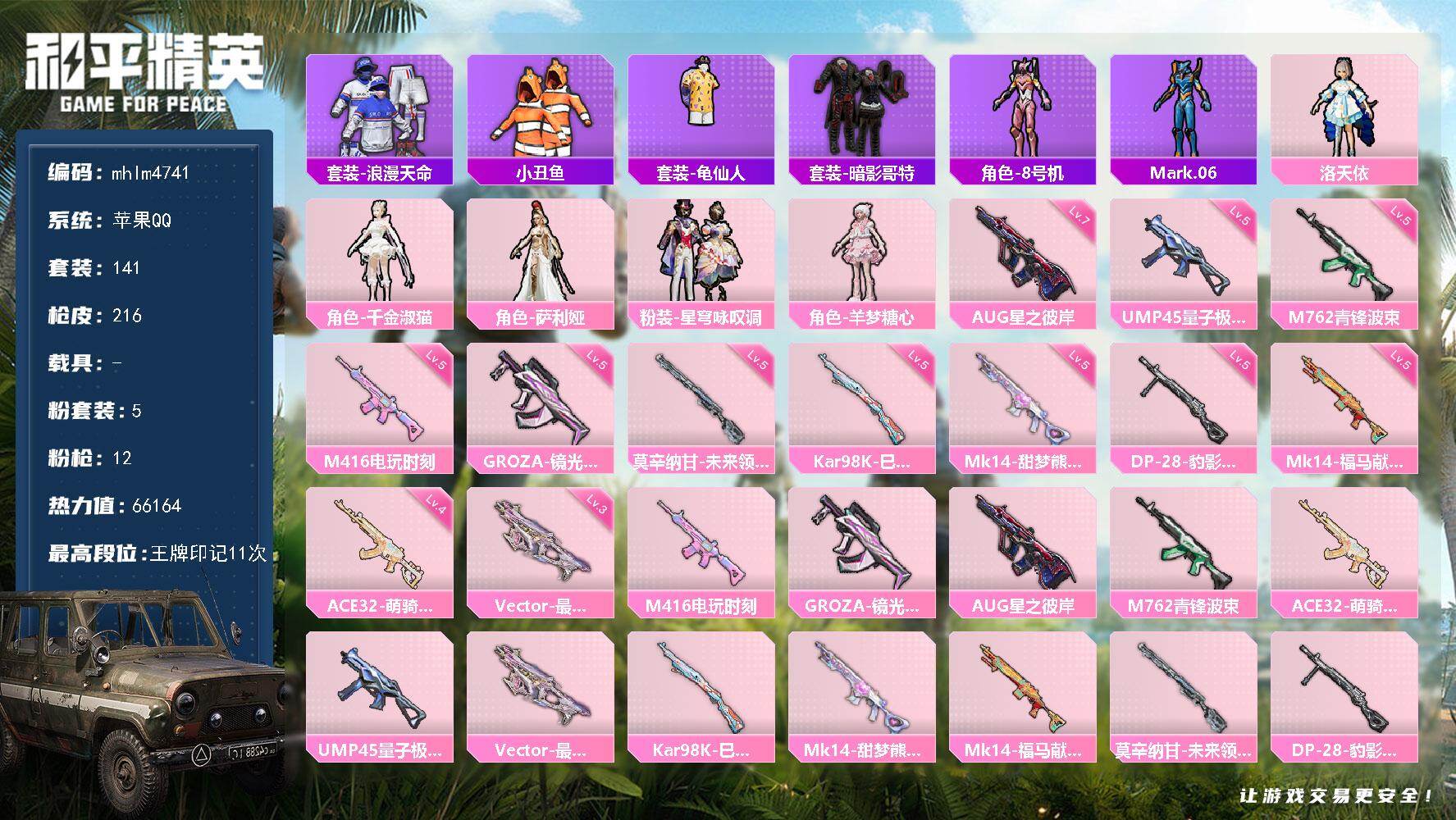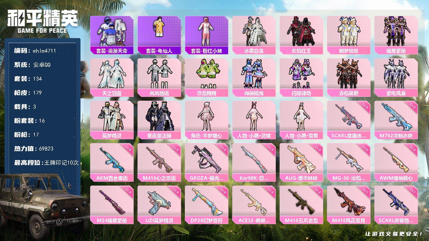 11王牌印记-4粉装-12特效枪-61343热力值-137套装-198枪皮-3卓越印记-1传奇印记