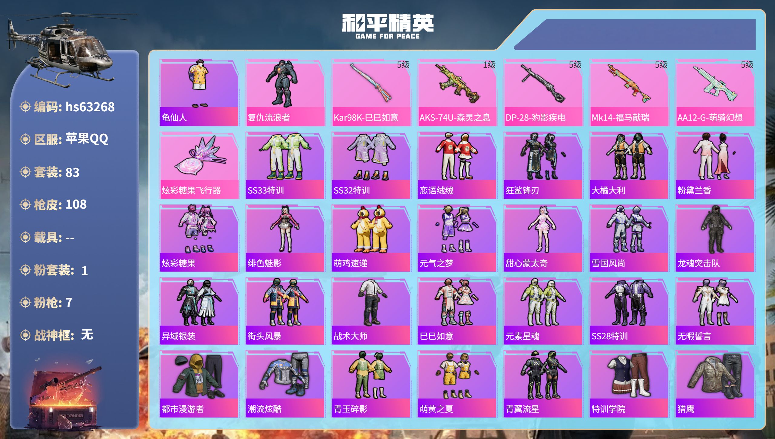 2王牌印记-1粉装-7特效枪-29411热力值-83套装-108枪皮