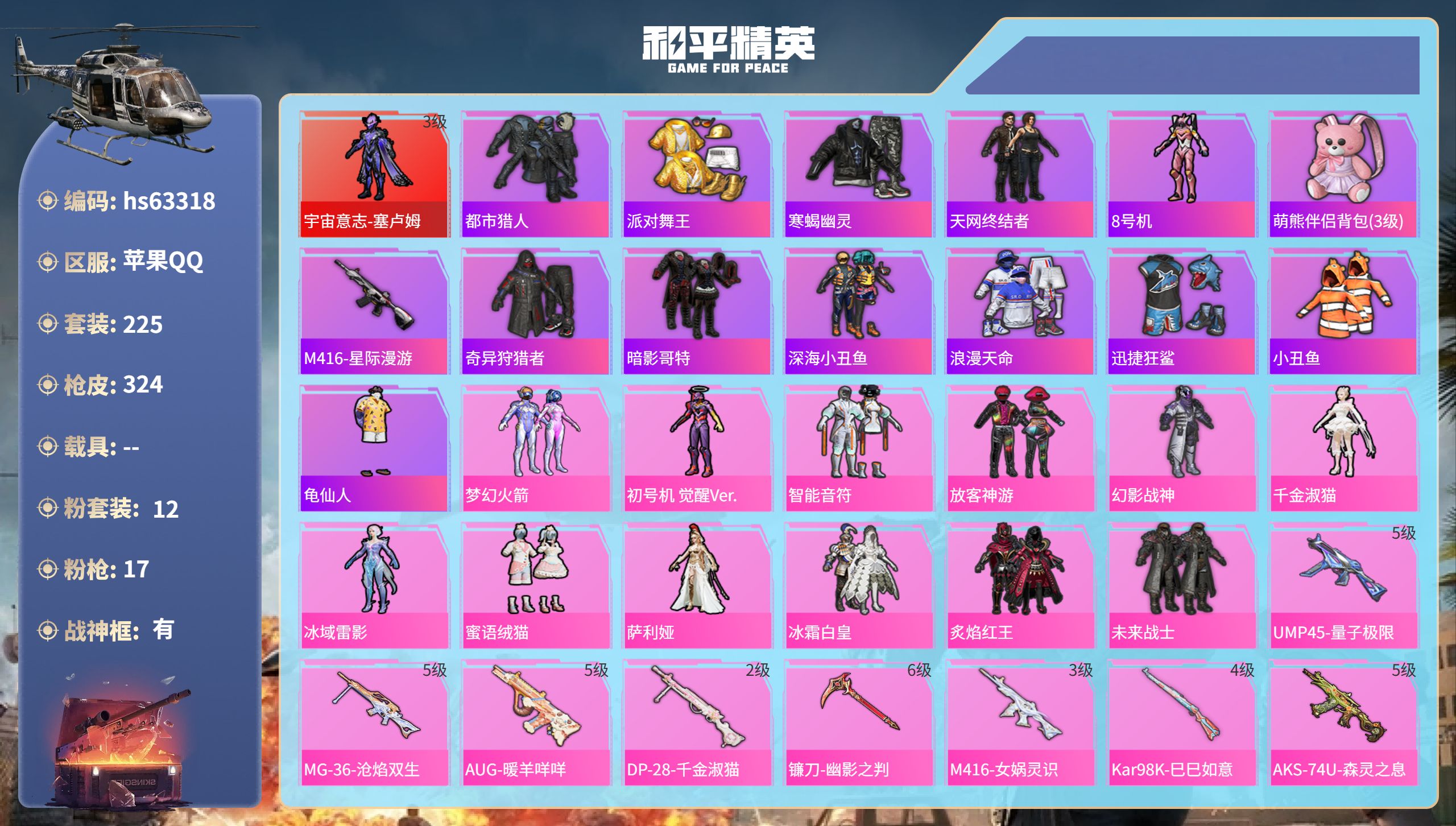 18王牌印记-有战神框-1红装-12粉装-17特效枪-热力值-225套装-324枪皮-8卓越印记-3传奇印记