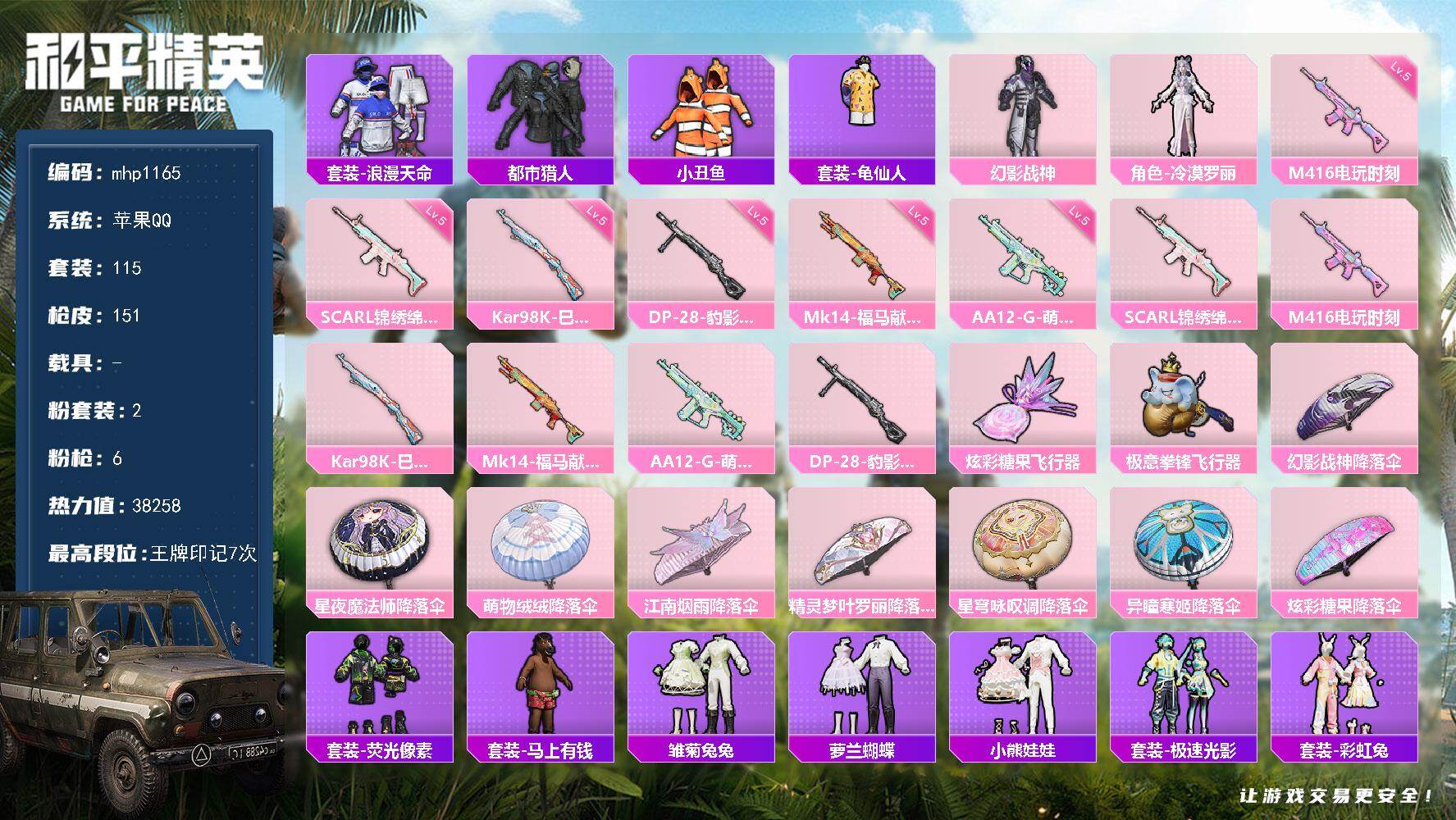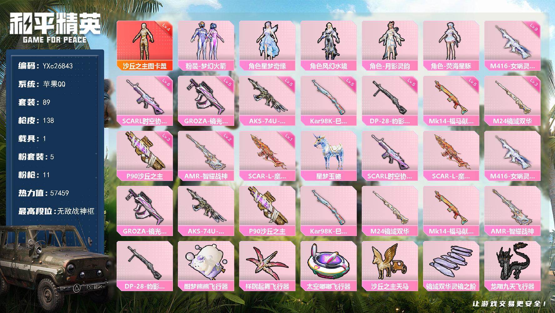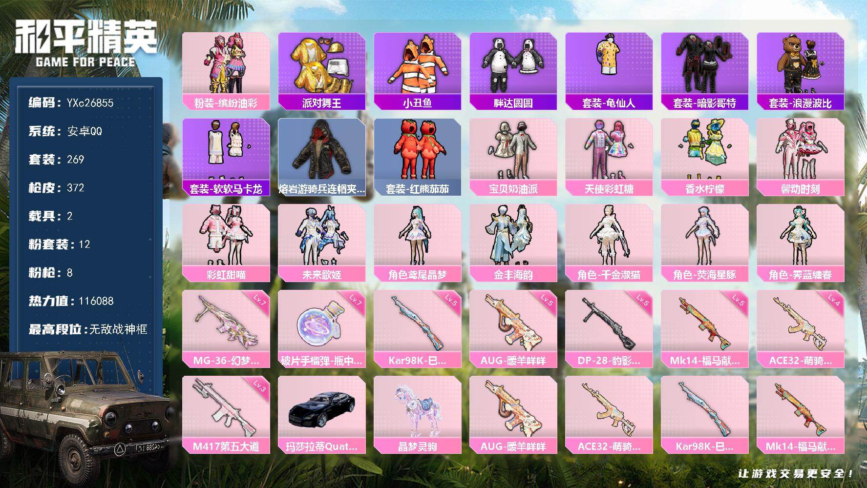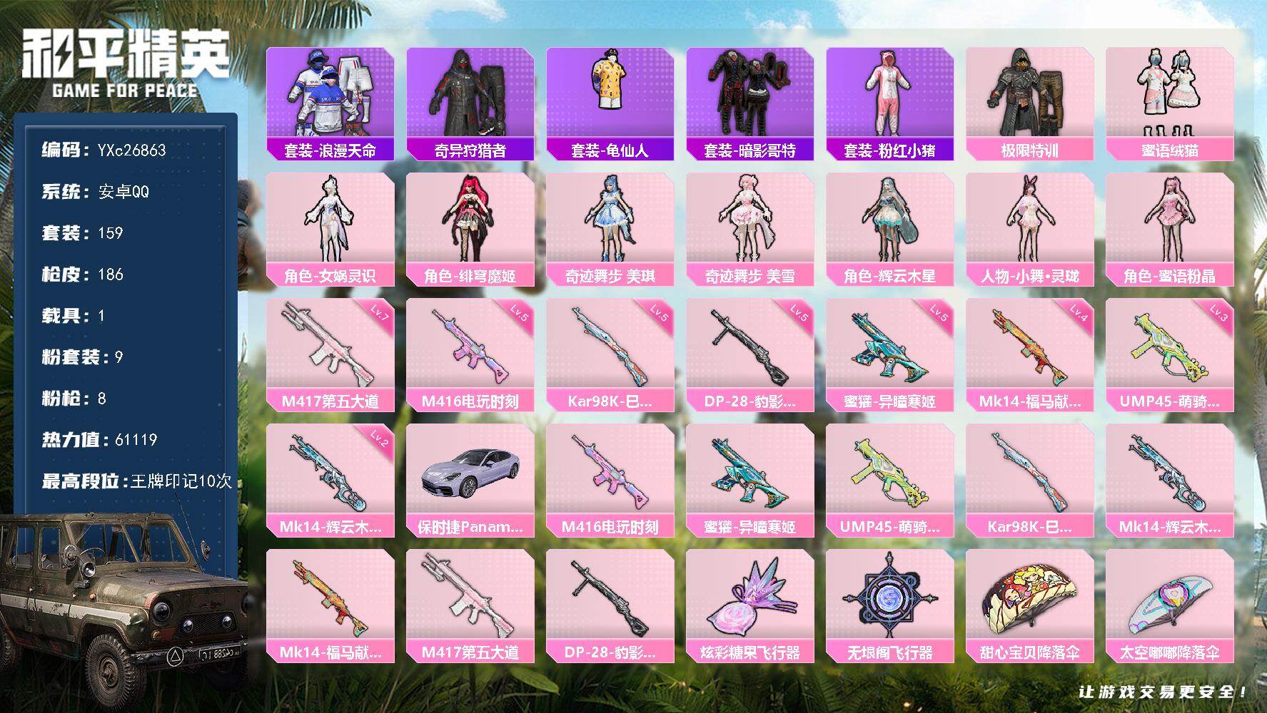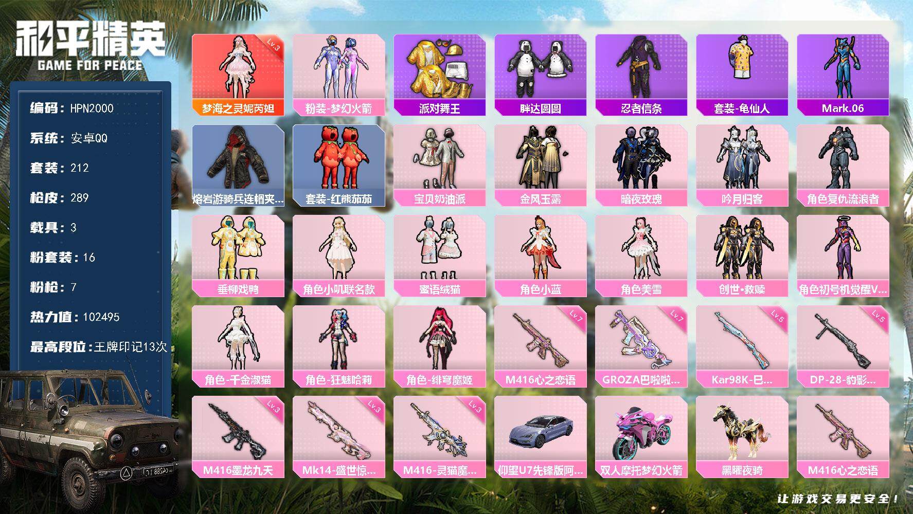 hs60455 安卓手Q-11王牌印记-10粉装-11特效枪-6载具-90031热力值-207套装-