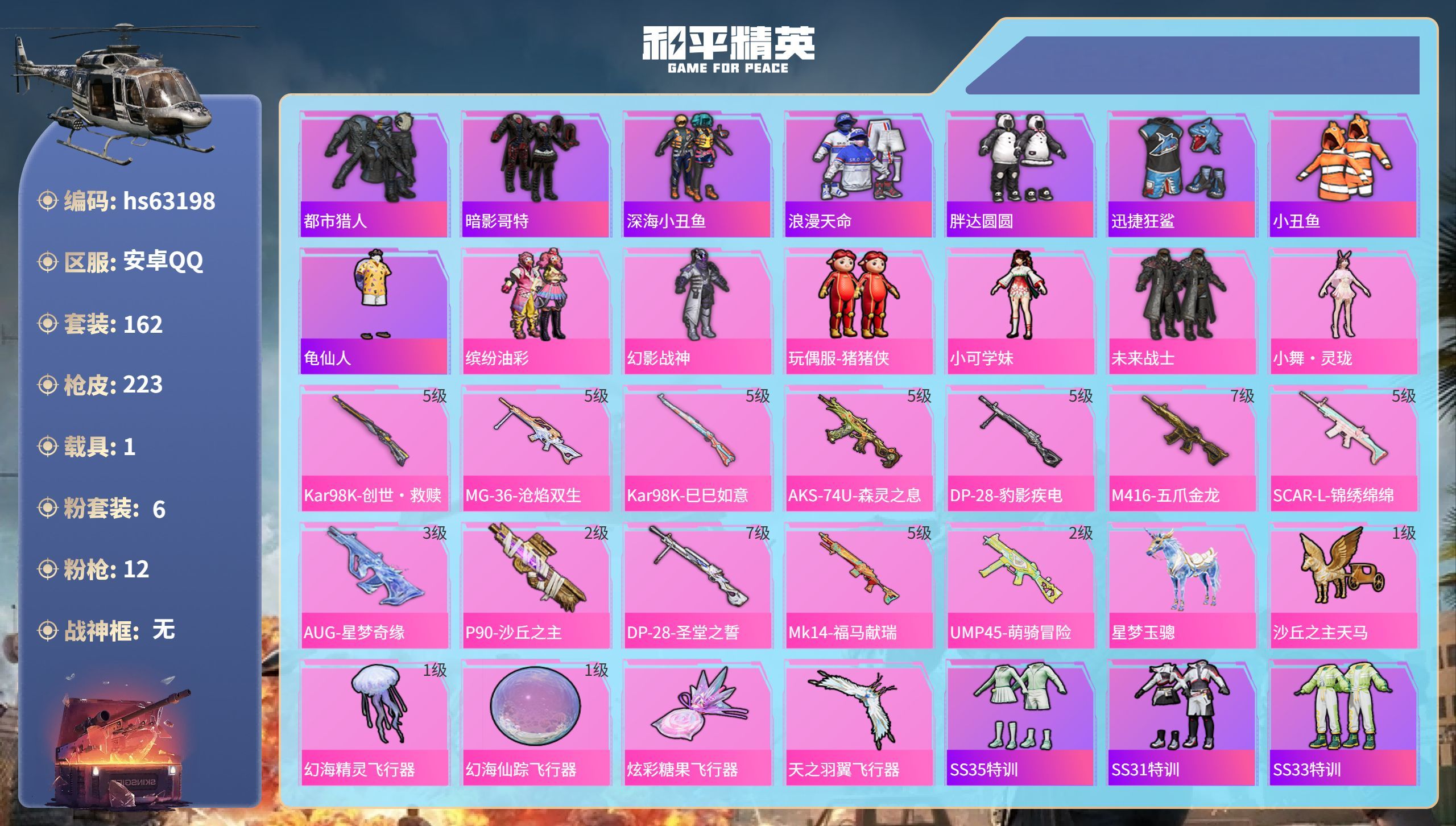 hs63198 安卓手Q-16王牌印记-6粉装-12特效枪-1载具-66856热力值-162套装-2
