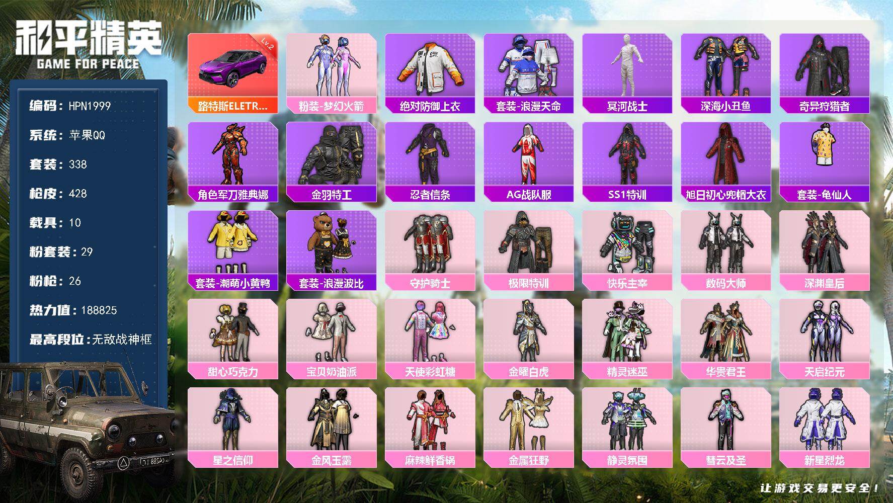可二次 满级宾利8载具10粉装2特效枪 -77942热力值-