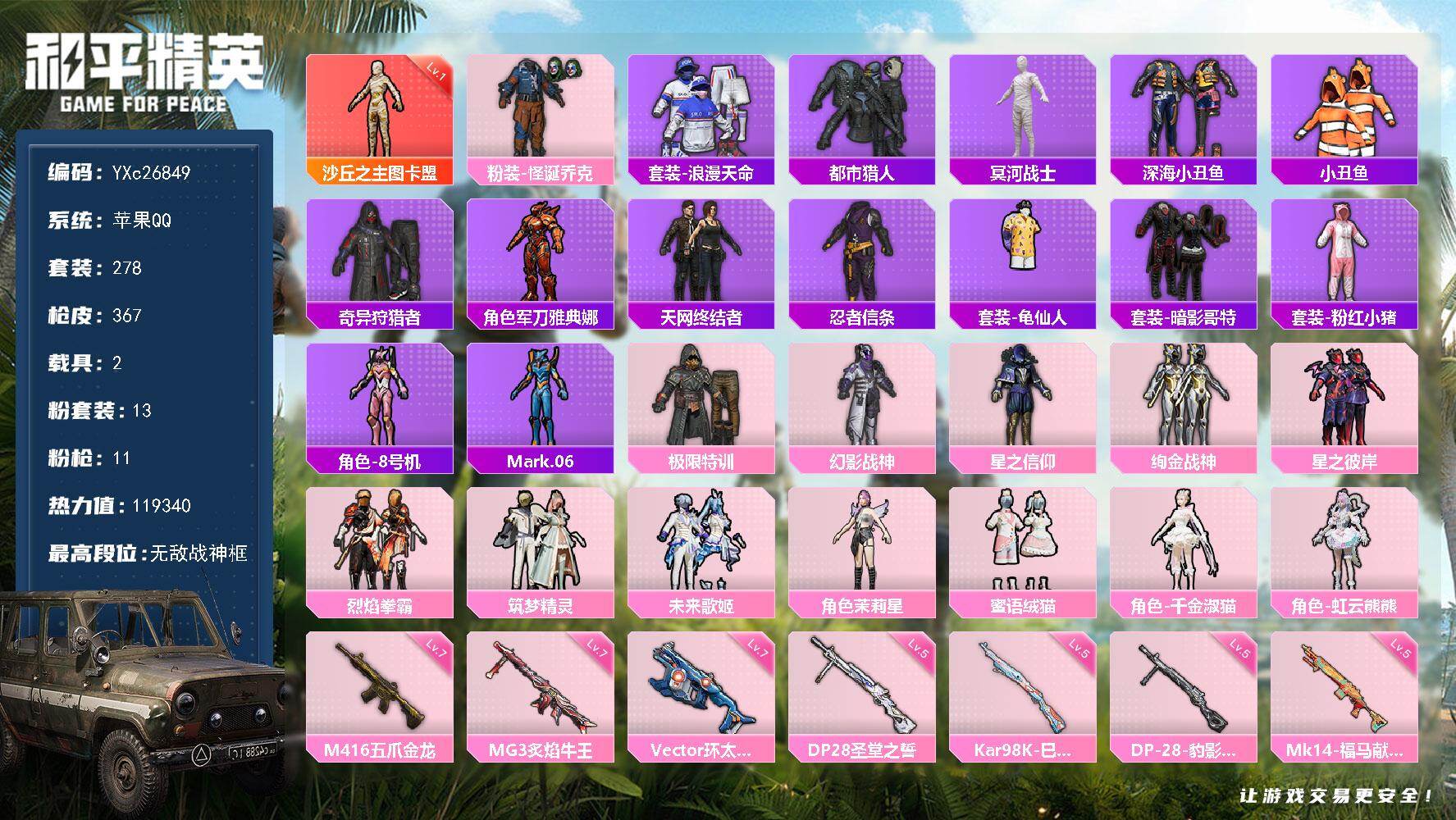 1红装7稀有3载具13粉装11特效枪32热门278套装367枪皮 11w热力值 21印记 历史无敌战神