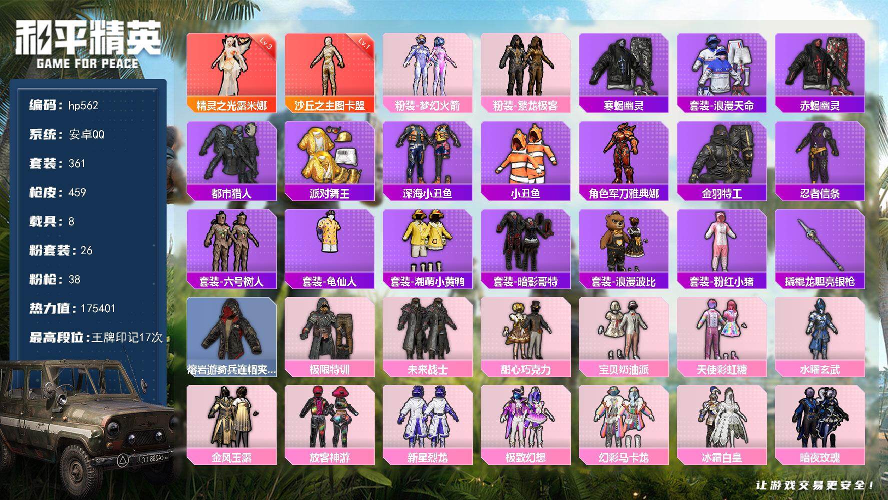 2神装-26粉装-38特效枪-8载具-16粉色飞行器-175401热力值-17王牌印记-361套装-459枪皮
