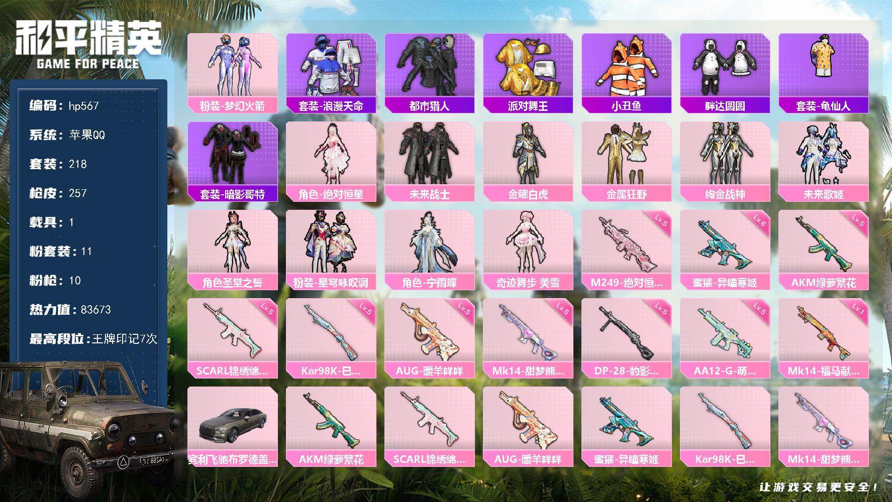 hs39621 苹果手Q-15王牌印记-1红装-12粉装-11特效枪-2载具-82095热力值-14