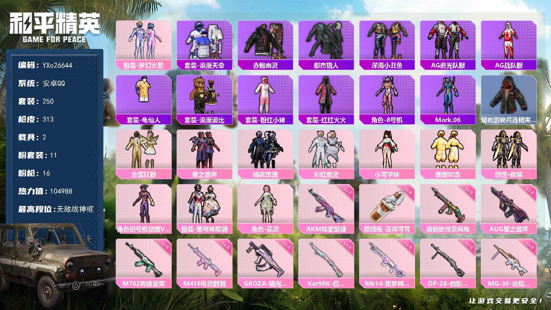 安卓 手Q-1神装-18粉装-21特效枪-3载具-16粉色飞行器-118910热