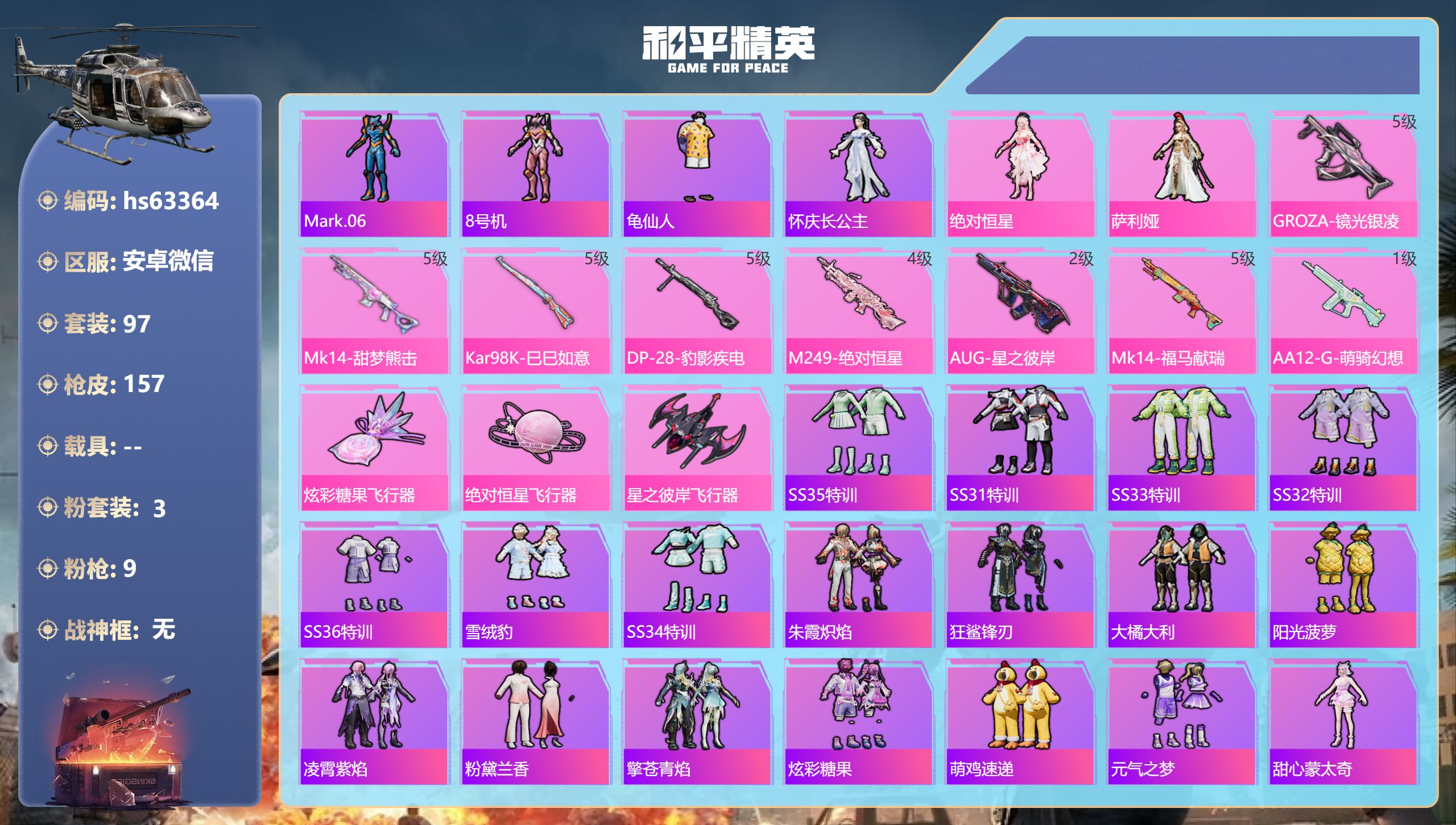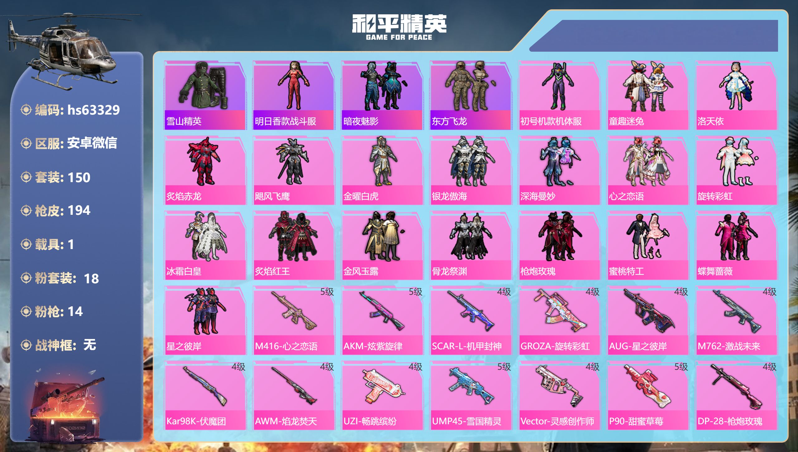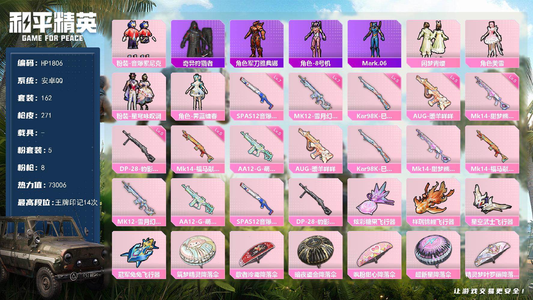13王牌印记-18粉装-14特效枪-1载具-70762热力值-150套装-194枪皮