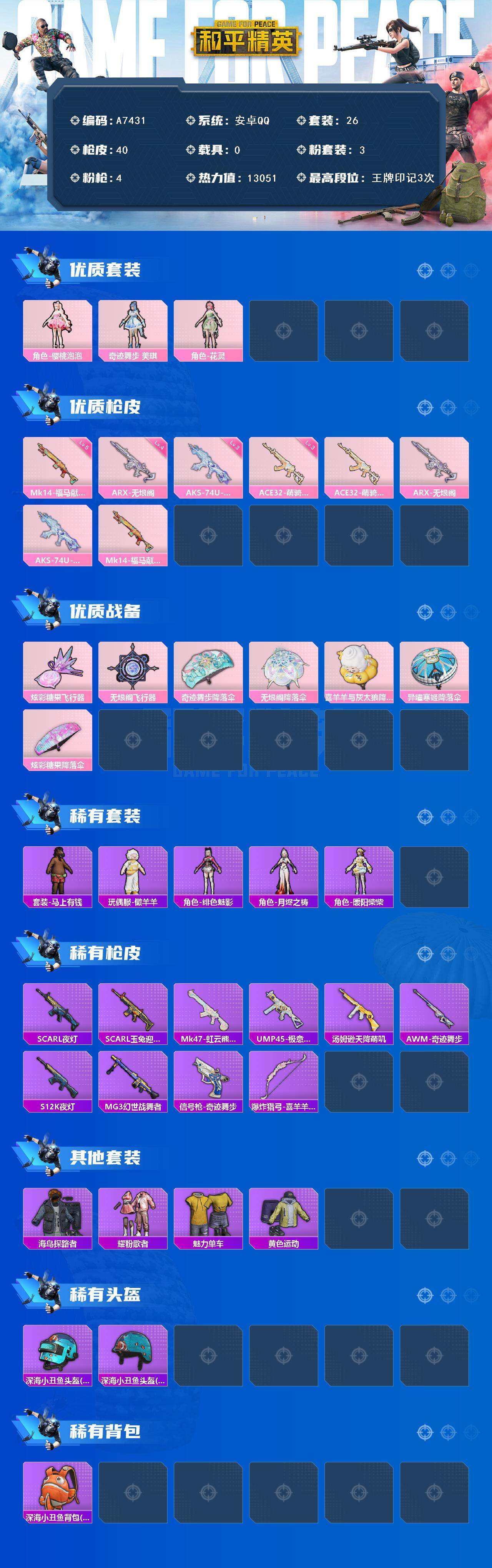 3粉装-4特效枪-0载具-2粉色飞行器-13051热力值-3王牌印记-26套装-40枪皮