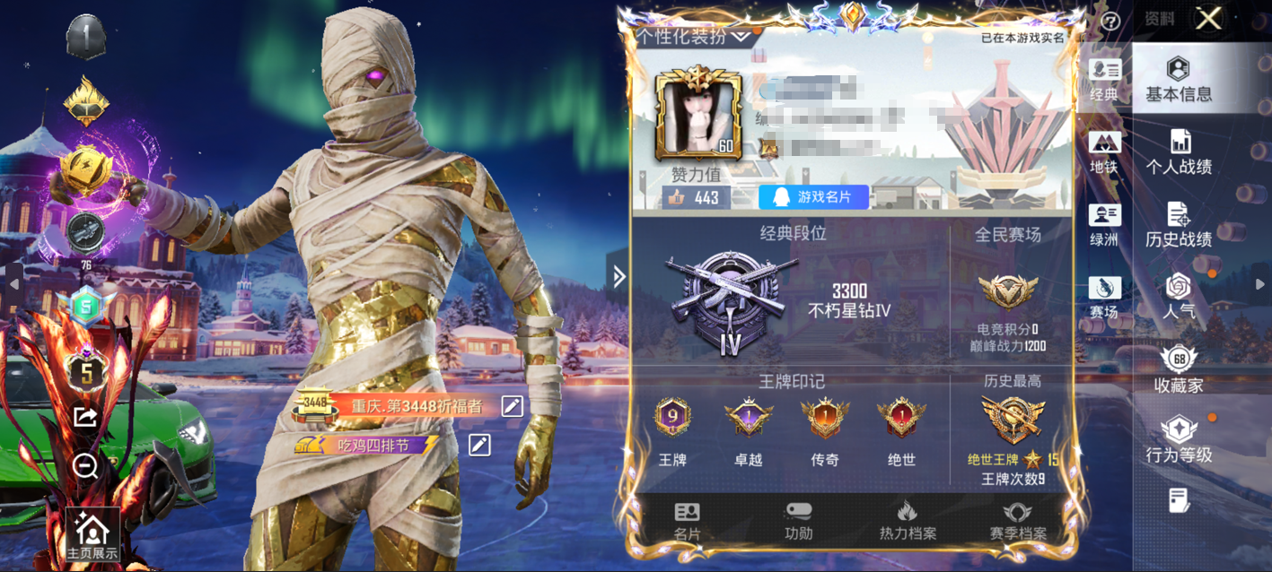 时装数: 328 载具数: 4 枪械数: 91 战备数: 70 热门装扮: 鹰