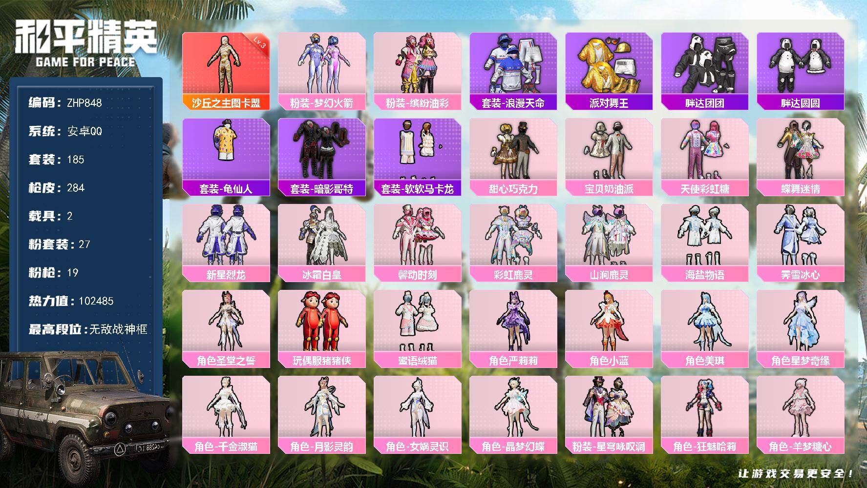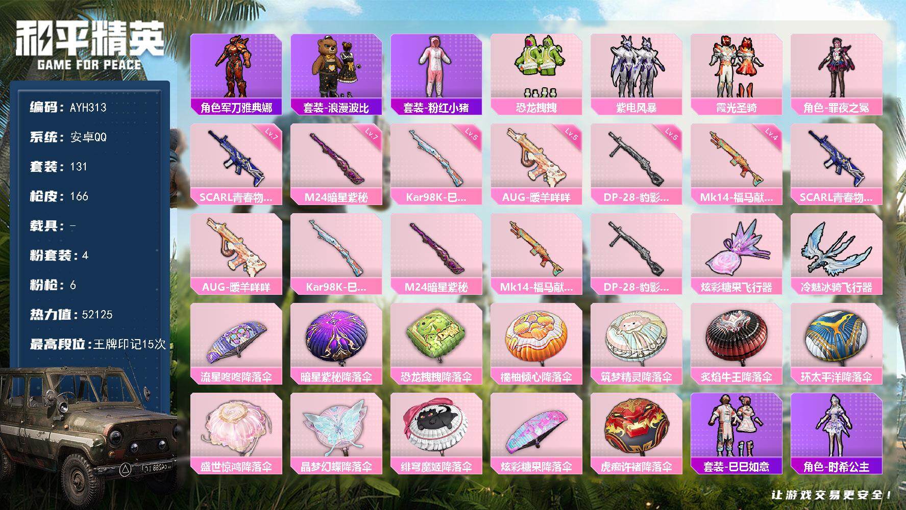 安卓 手Q-4粉装-6特效枪-0载具-2粉色飞行器-52125热力值-15王牌印
