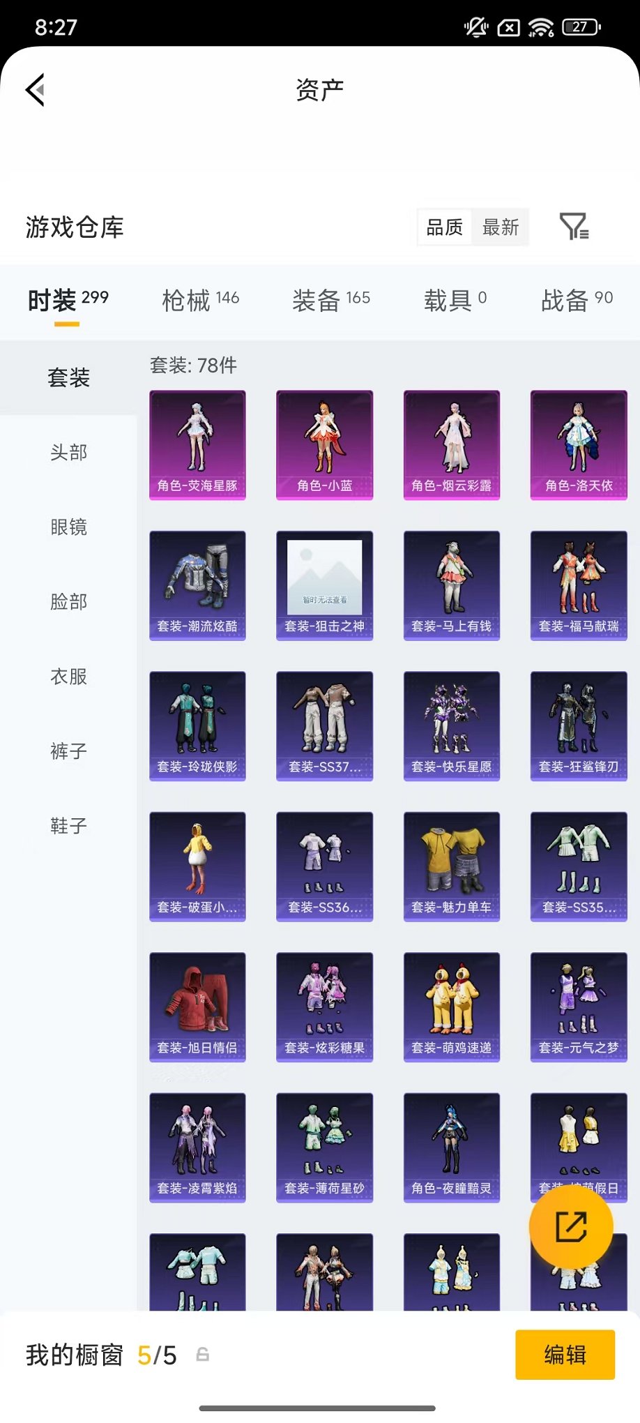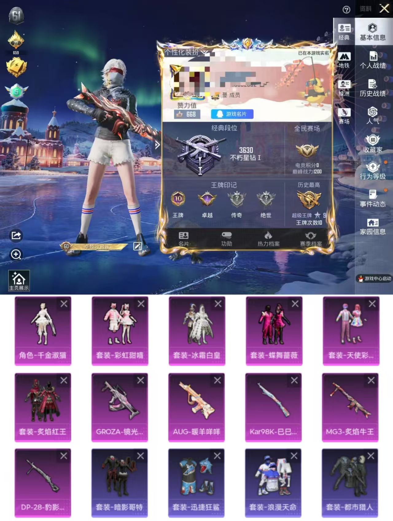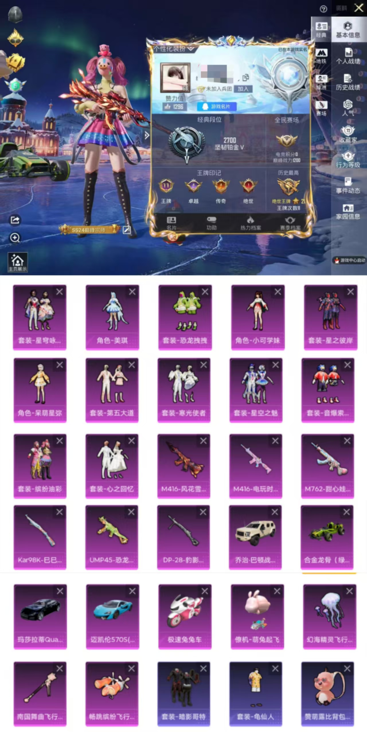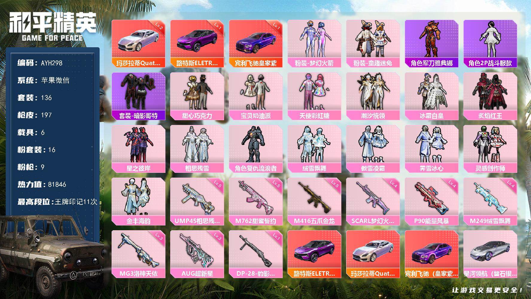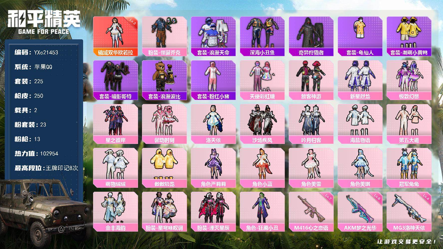 1神装-14粉装-8特效枪-6载具-6粉色飞行器-86826热力值-17王牌印记-198套装-239枪皮