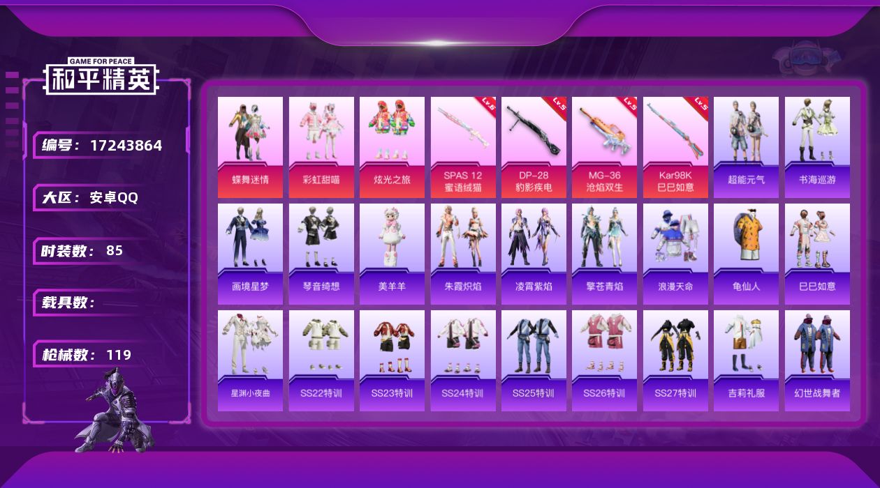 2级图卡盟!新101!苹果 微信-1神装-2粉装-7特效枪-1载具-4粉色飞行器