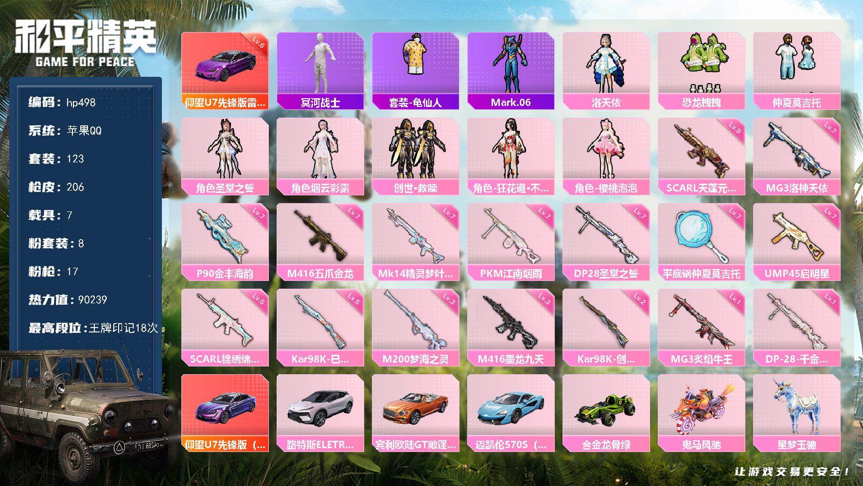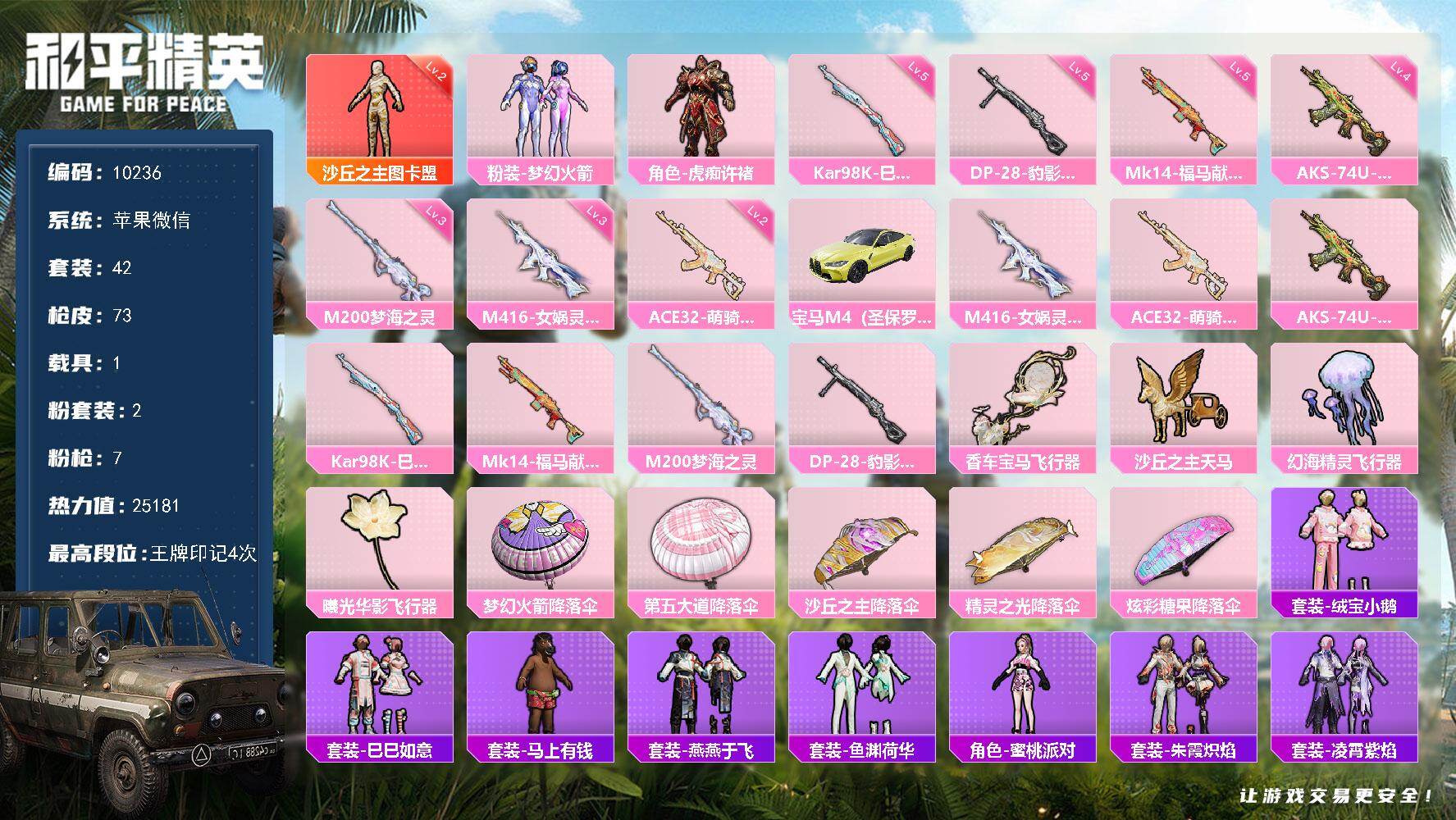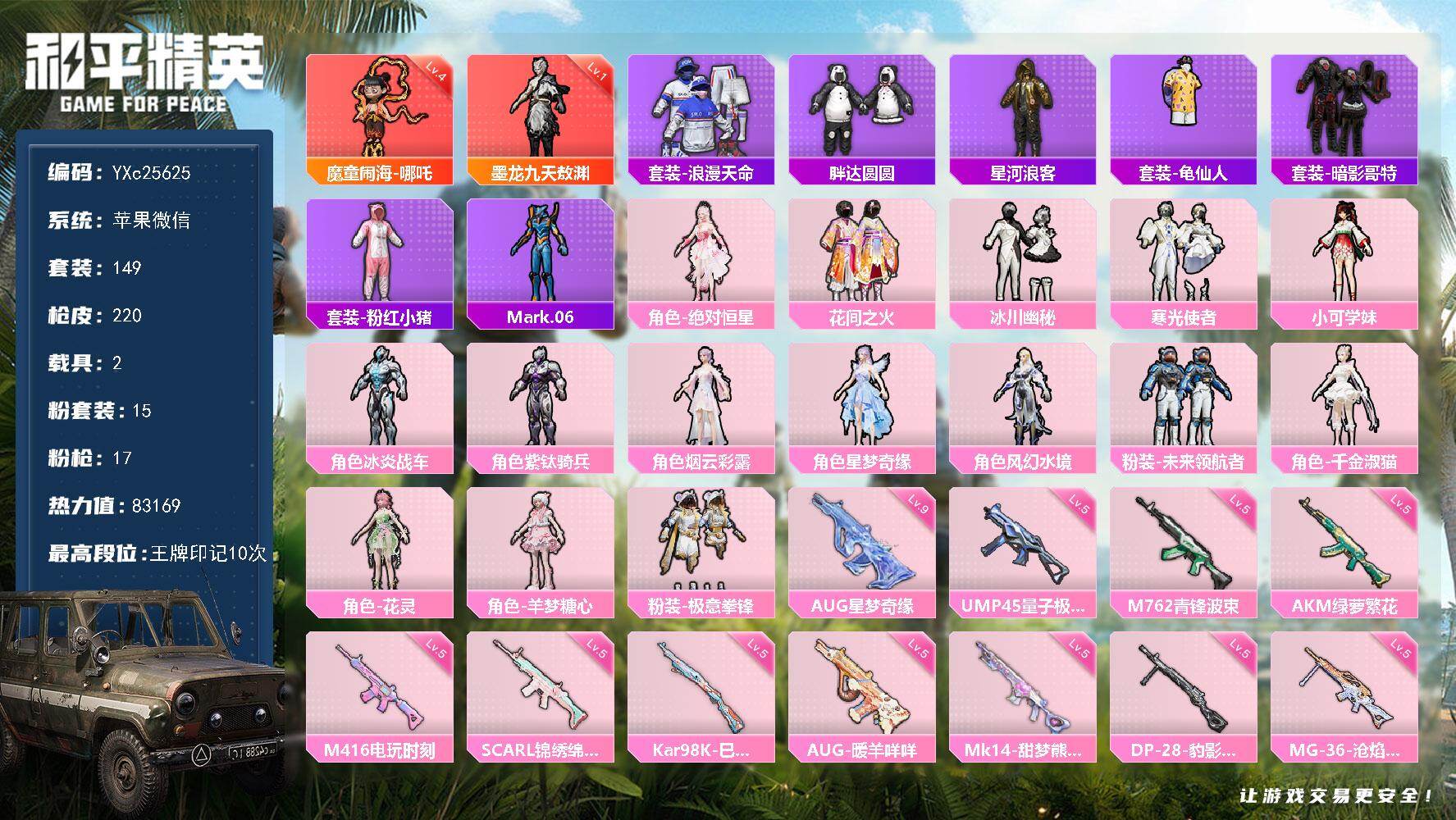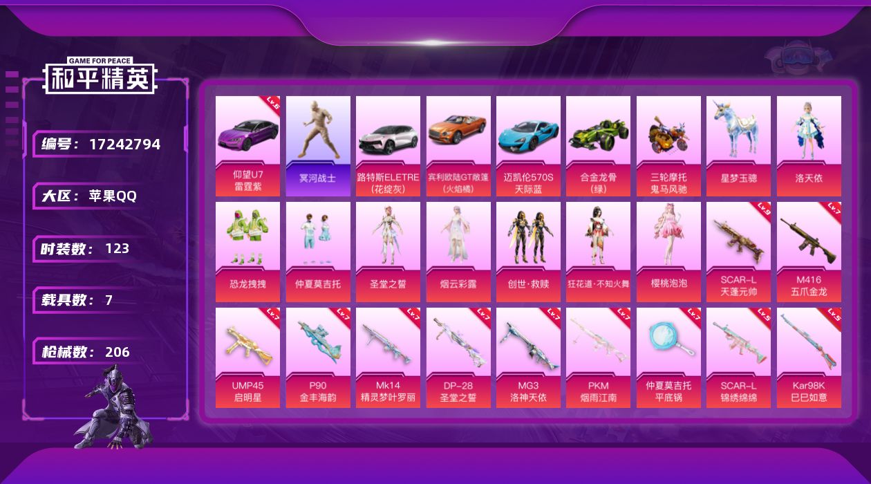2级图卡盟!新101!苹果 微信-1神装-2粉装-7特效枪-1载具-4粉色飞行