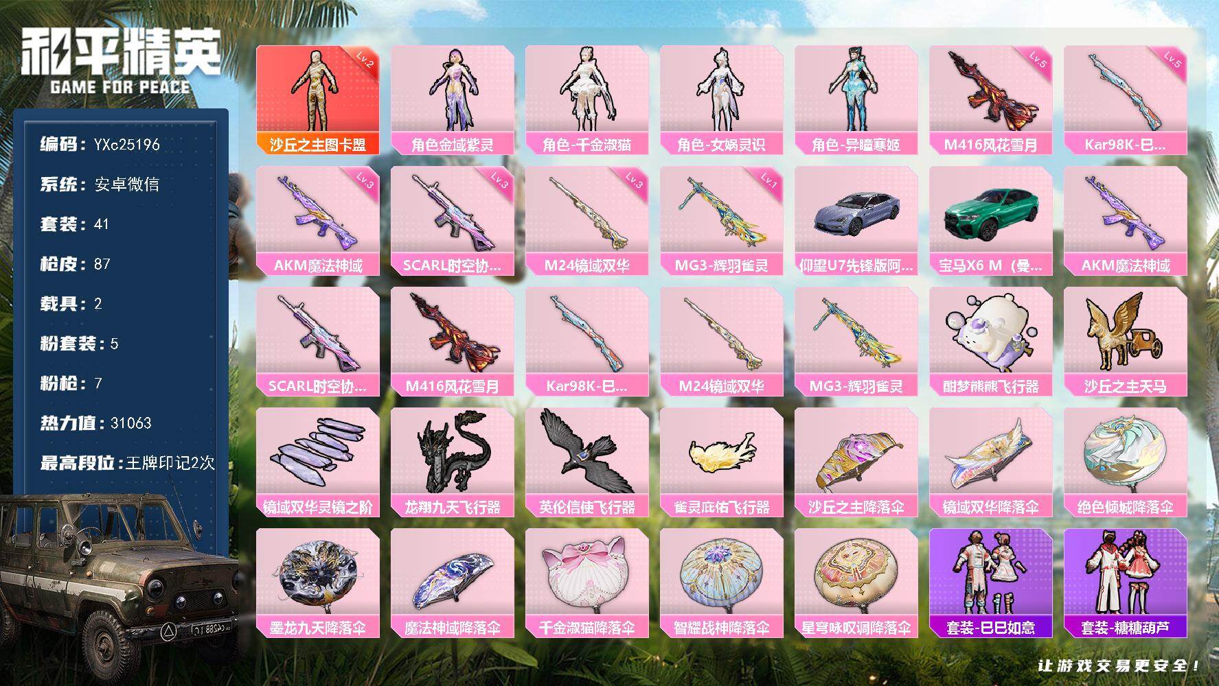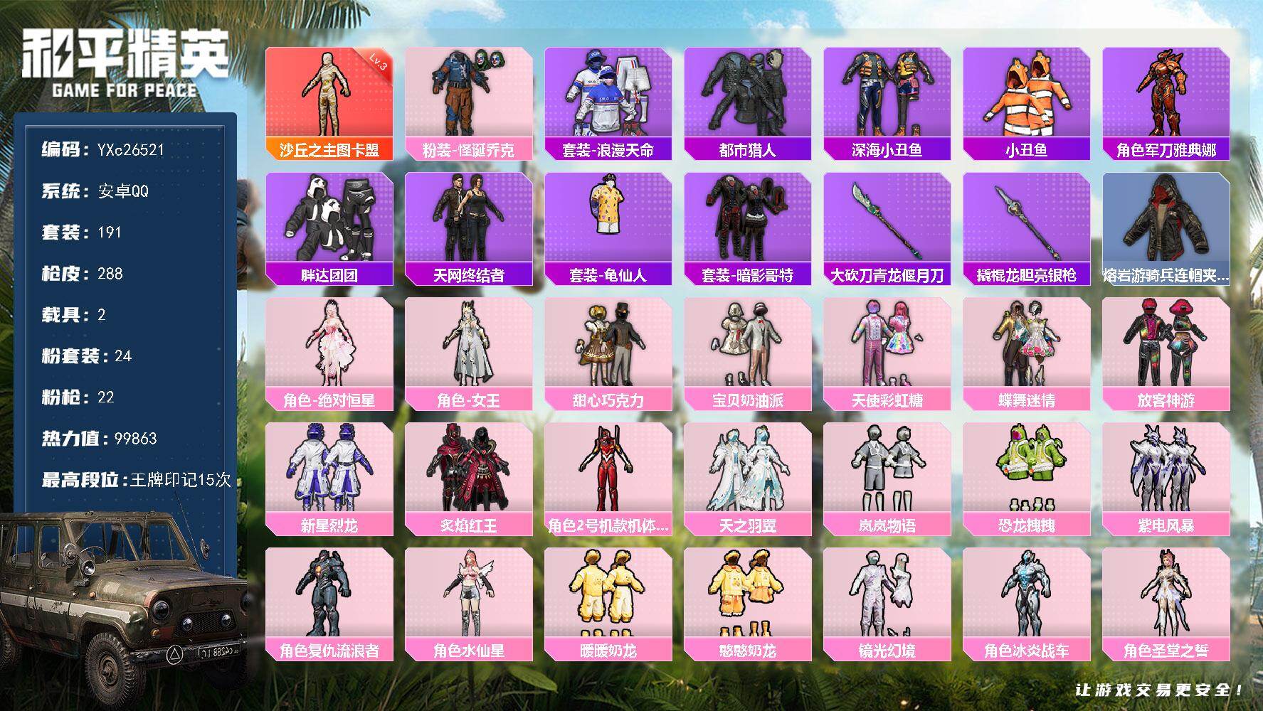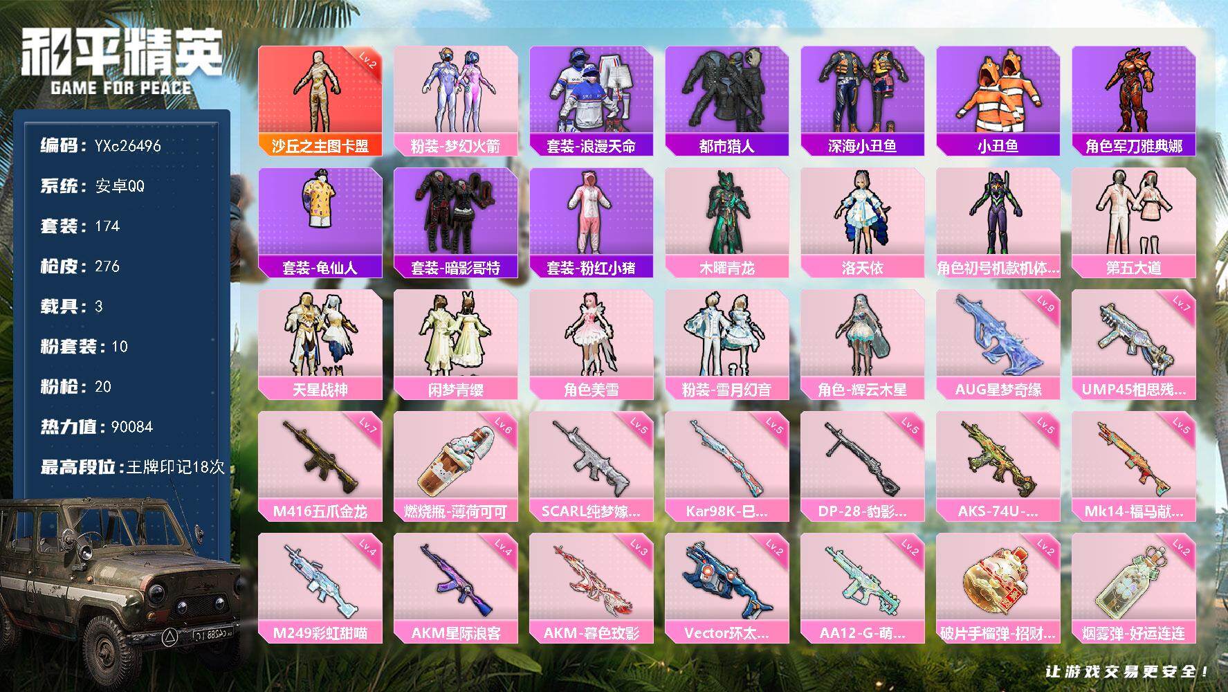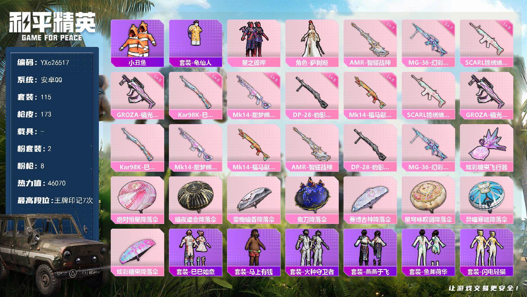 2级图卡盟!新101!苹果 微信-1神装-2粉装-7特效枪-1载具-4粉色飞行