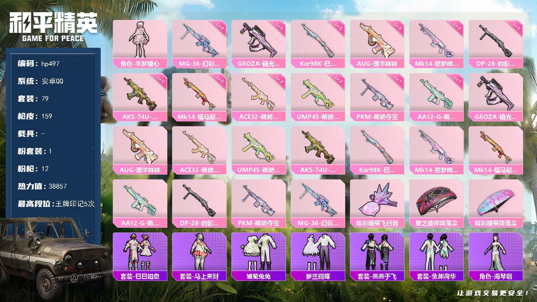 1粉装-12特效枪-0载具-1粉色飞行器-38857热力值-5王牌印记-79套装-159枪皮