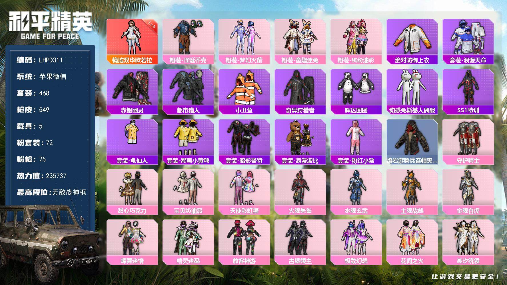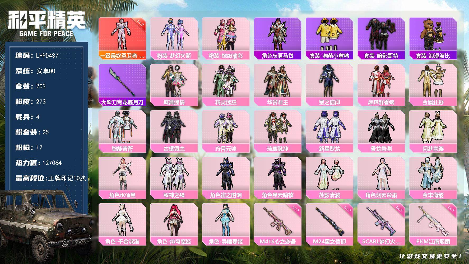 1神装-25粉装-17特效枪-4载具-16粉色飞行器-127064热力值-10王牌印记-203套装-273枪皮