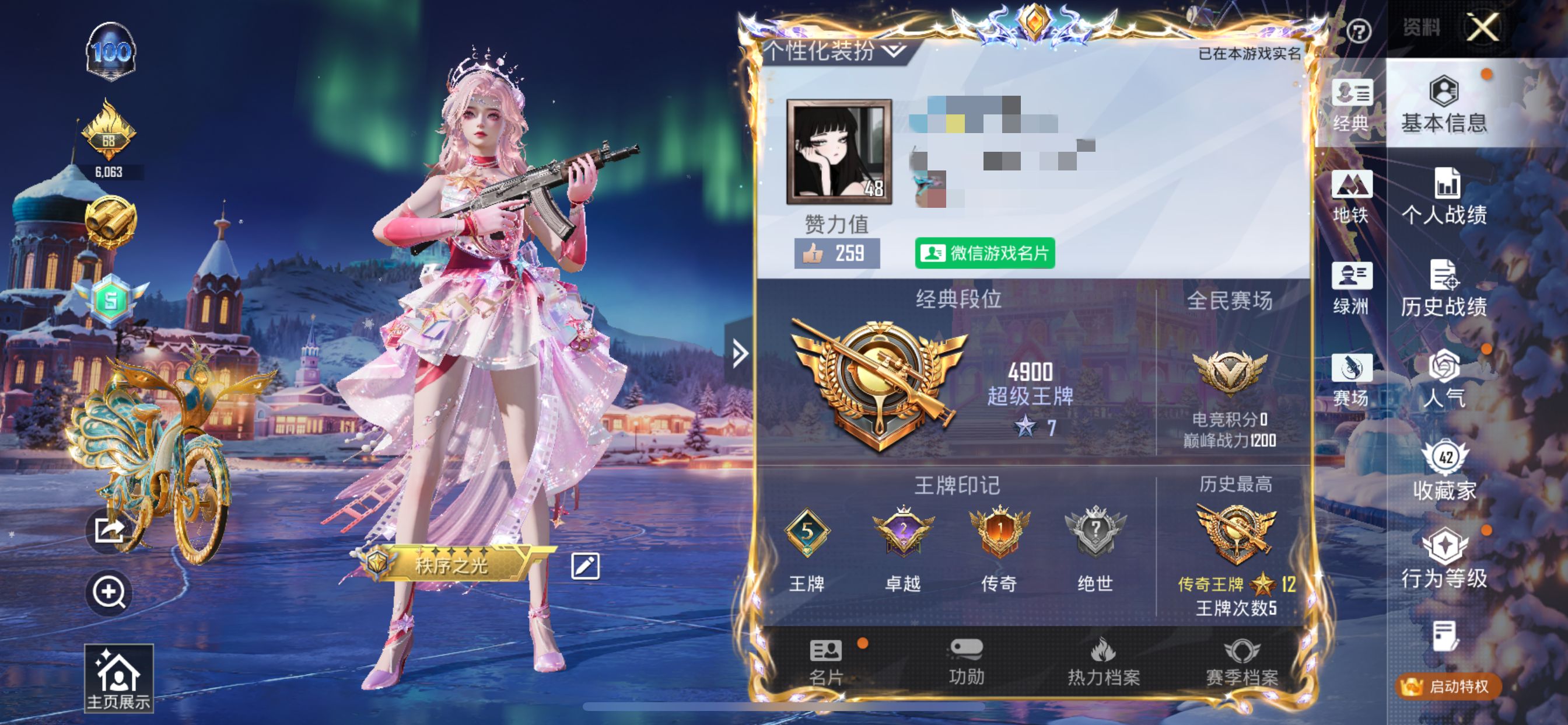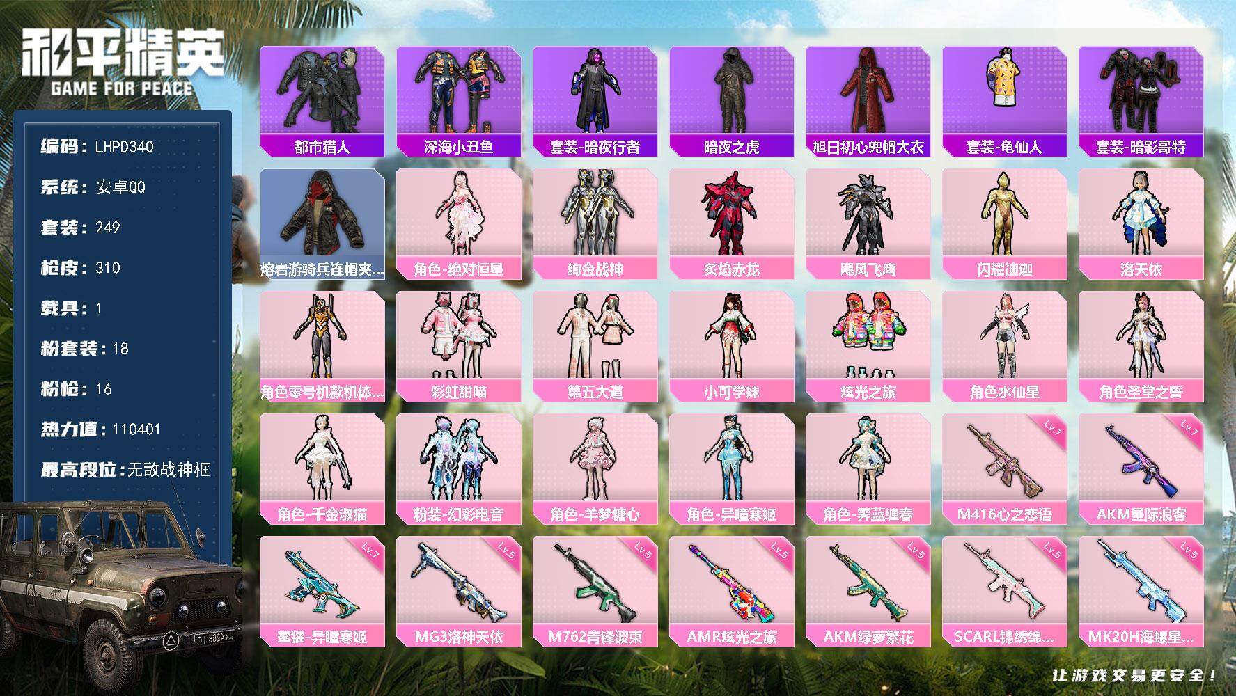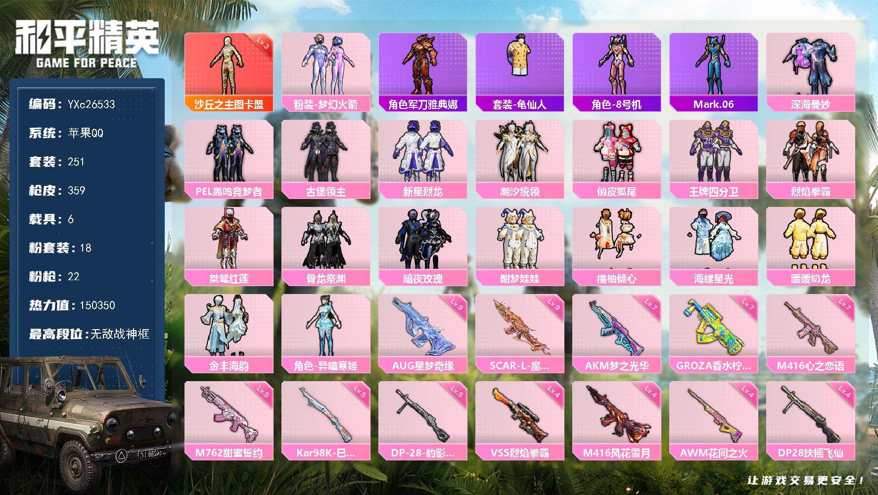无敌战神框-18粉装-16特效枪-1载具-3粉色飞行器-110401热力值-17王牌印记-249套装-310枪皮