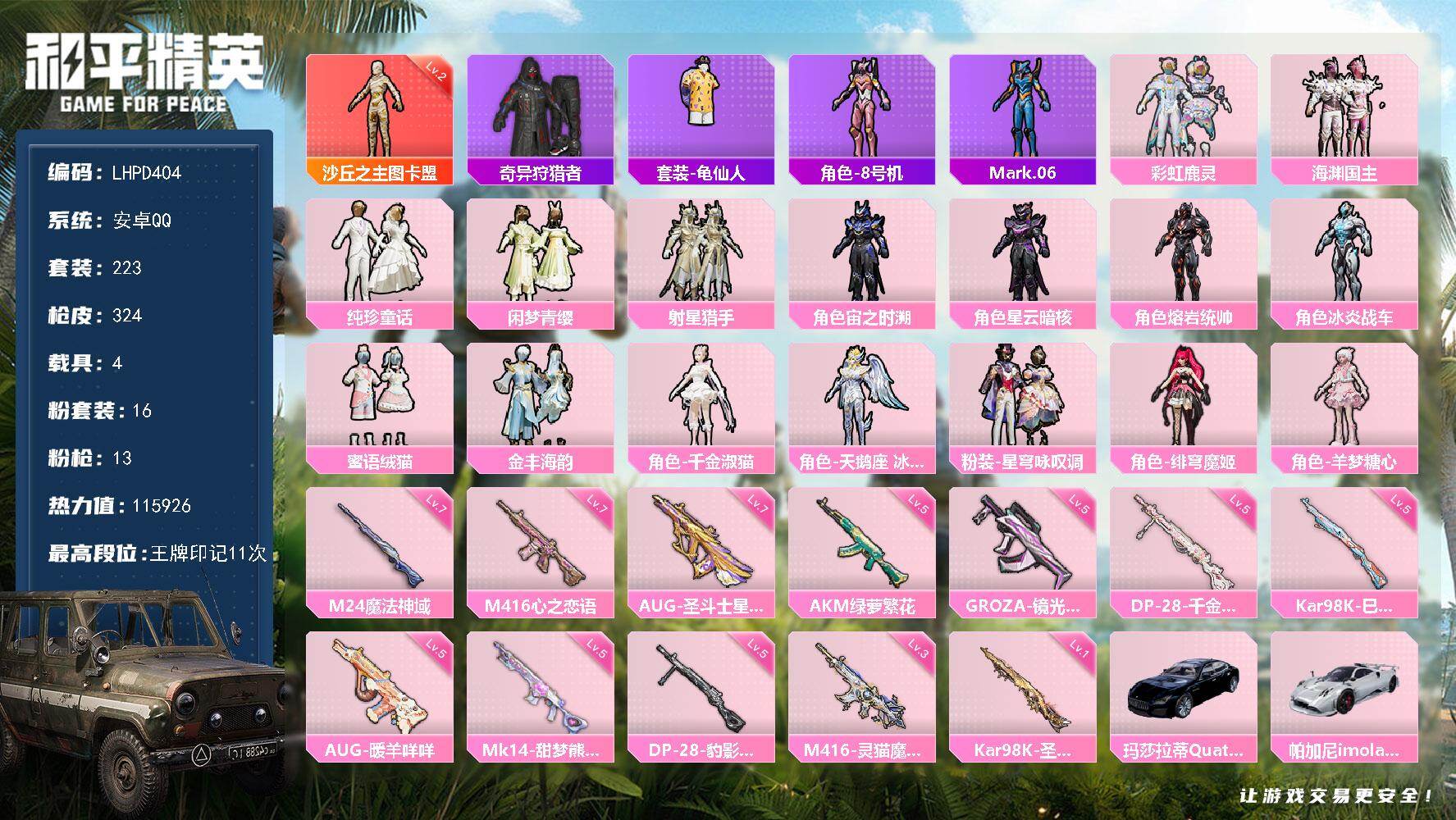 12粉装-11特效枪-4载具-8粉色飞行器-83936热力值-13王牌印记-139套装-230枪皮