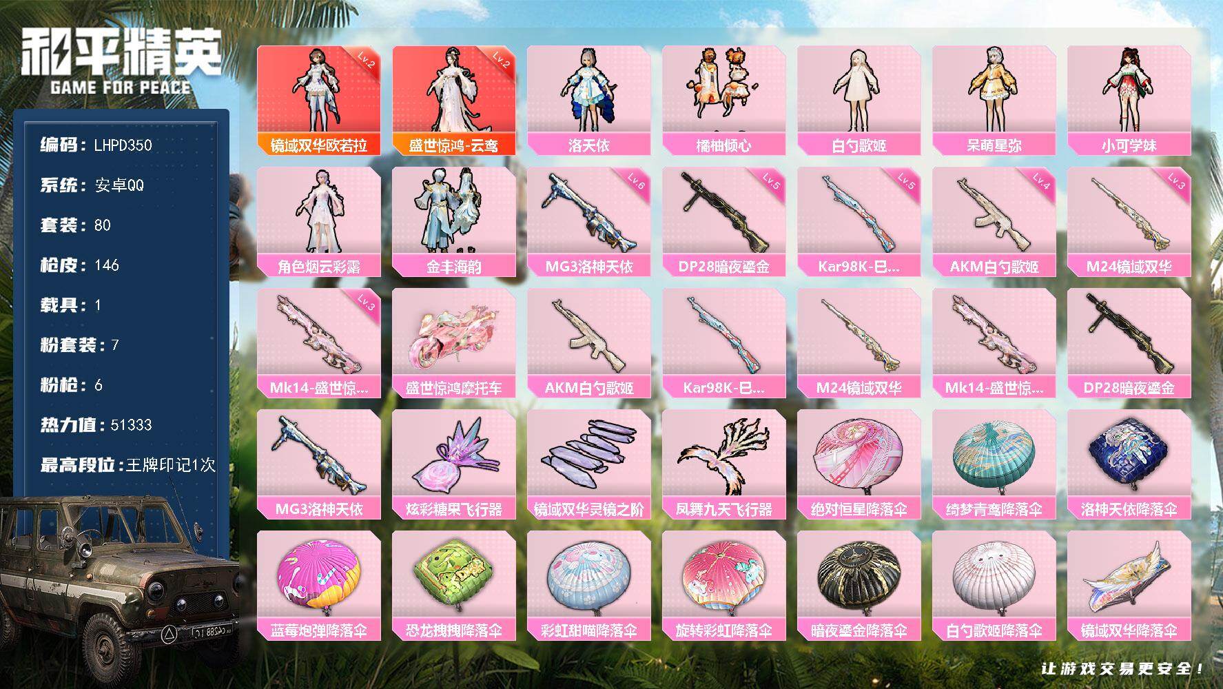 2神装-7粉装-6特效枪-1载具-3粉色飞行器-5·1w热力值-1王牌印记-80套装-146枪皮