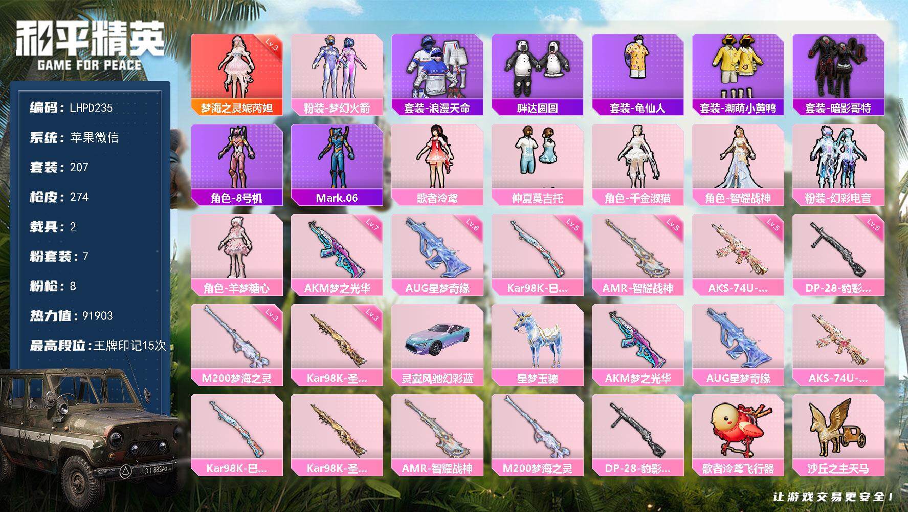 15粉装-10特效枪-7载具-4粉色飞行器-91581热力值-4王牌印记-162套装-214枪皮