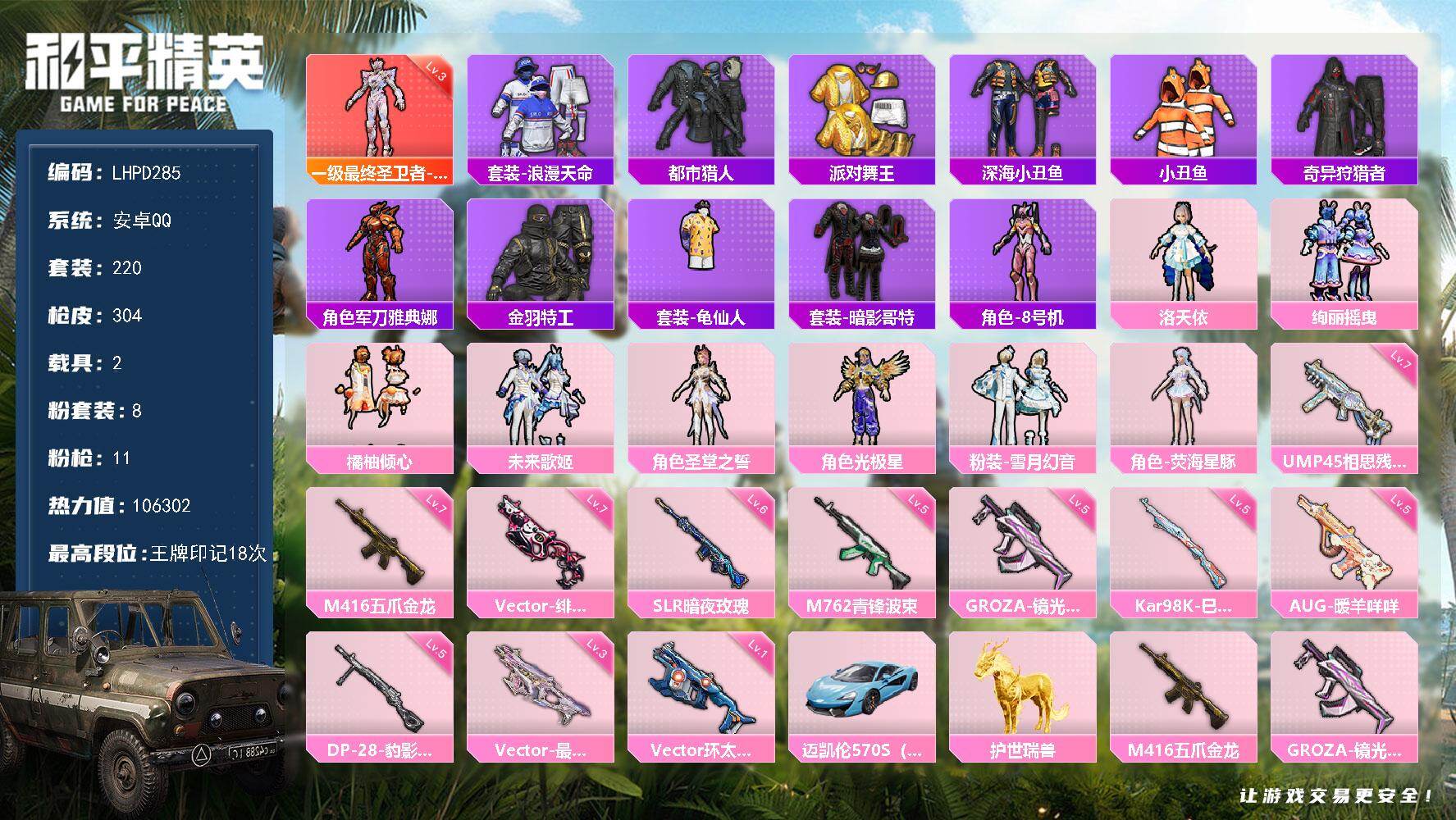 1神装-8粉装-11特效枪-2载具-10粉色飞行器-106302热力值-18王牌印记-220套装-304枪皮