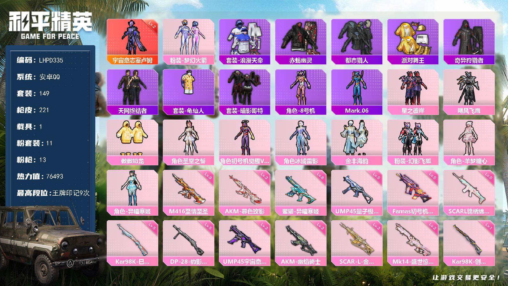 2神装-3粉装-6特效枪-2载具-3粉色飞行器-60725热力值-9王牌印记-124套装-174枪皮