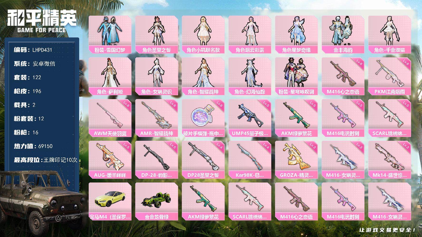 12粉装-16特效枪-2载具-4粉色飞行器-69150热力值-10王牌印记-122套装-196枪皮