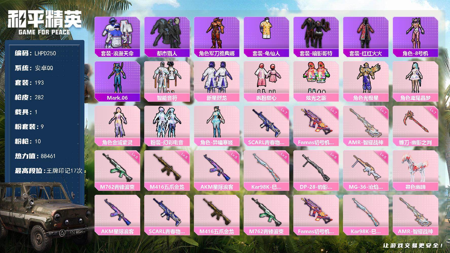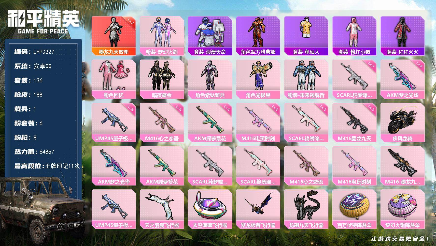 7粉装-5特效枪-5载具-10粉色飞行器-38905热力值-5王牌印记-57套装-102枪皮