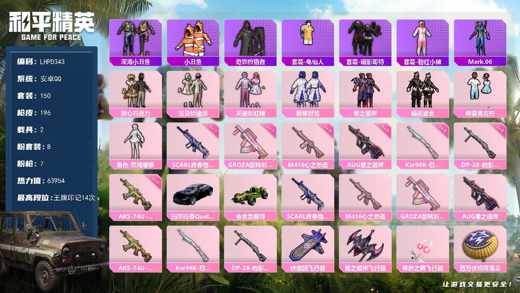 8粉装-7特效枪-2载具-3粉色飞行器-63954热力值-14王牌印记-150套装-196枪皮