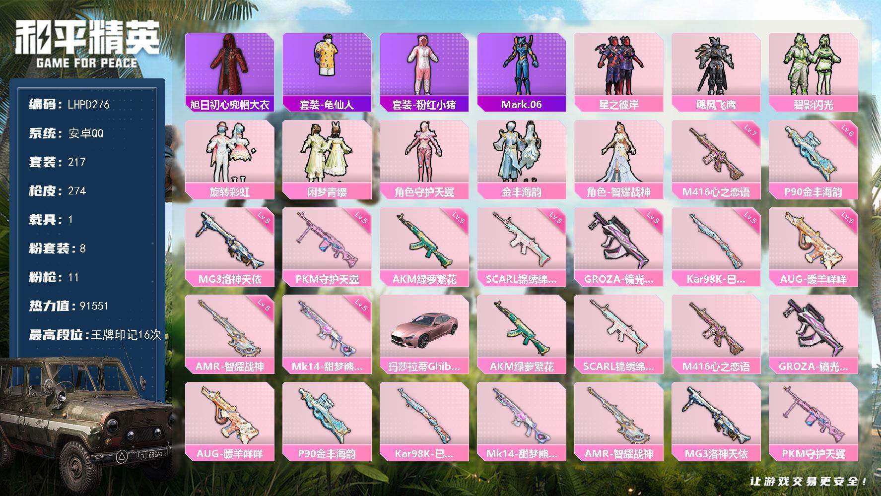 8粉装-11特效枪-1载具-2粉色飞行器-91551热力值-16王牌印记-217套装-274枪皮