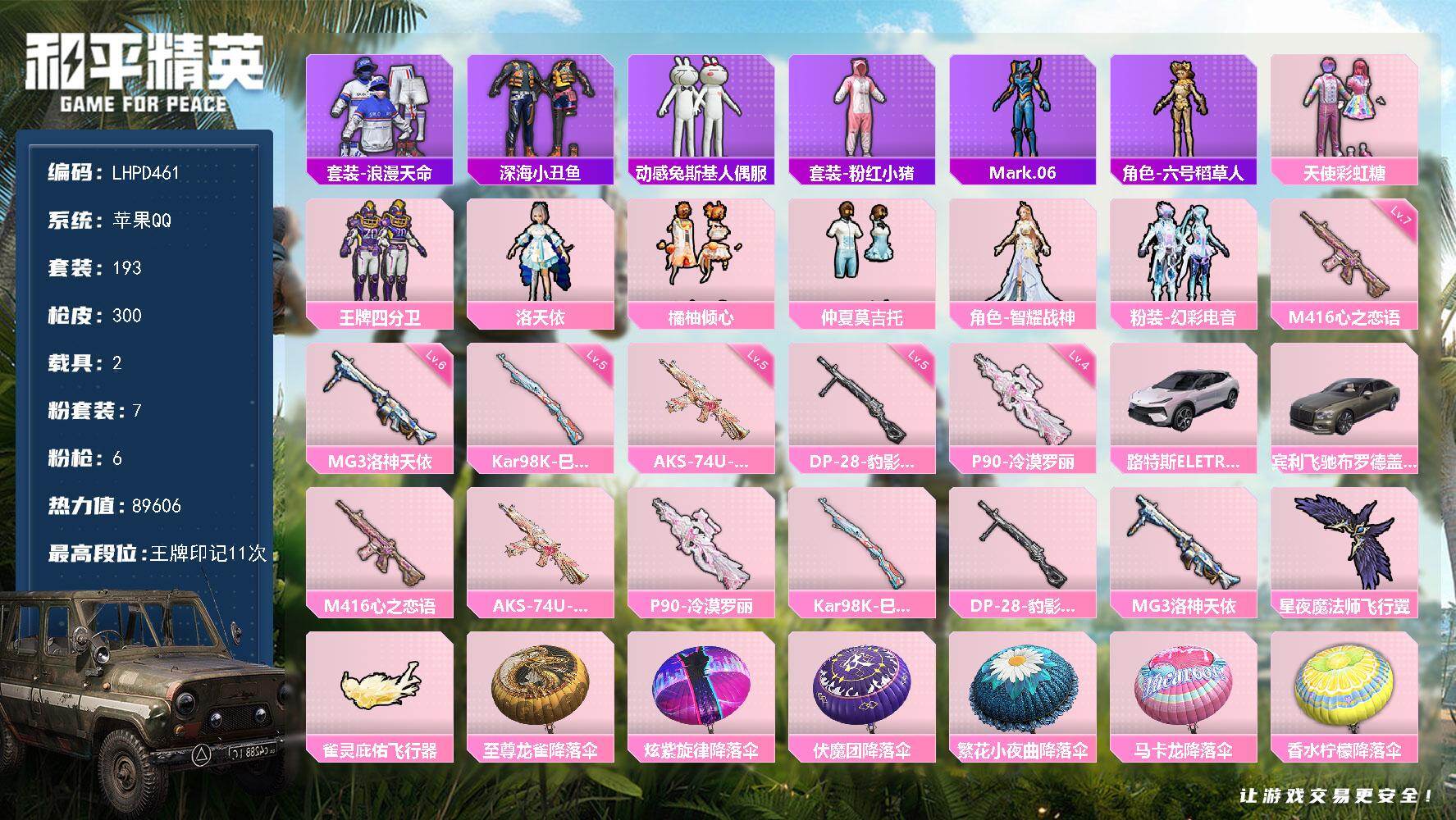 7粉装-6特效枪-2载具-2粉色飞行器-89606热力值-11王牌印记-193套装-300枪皮