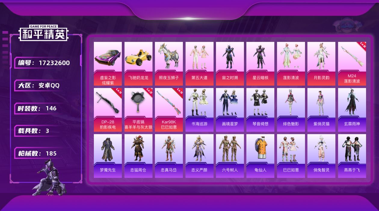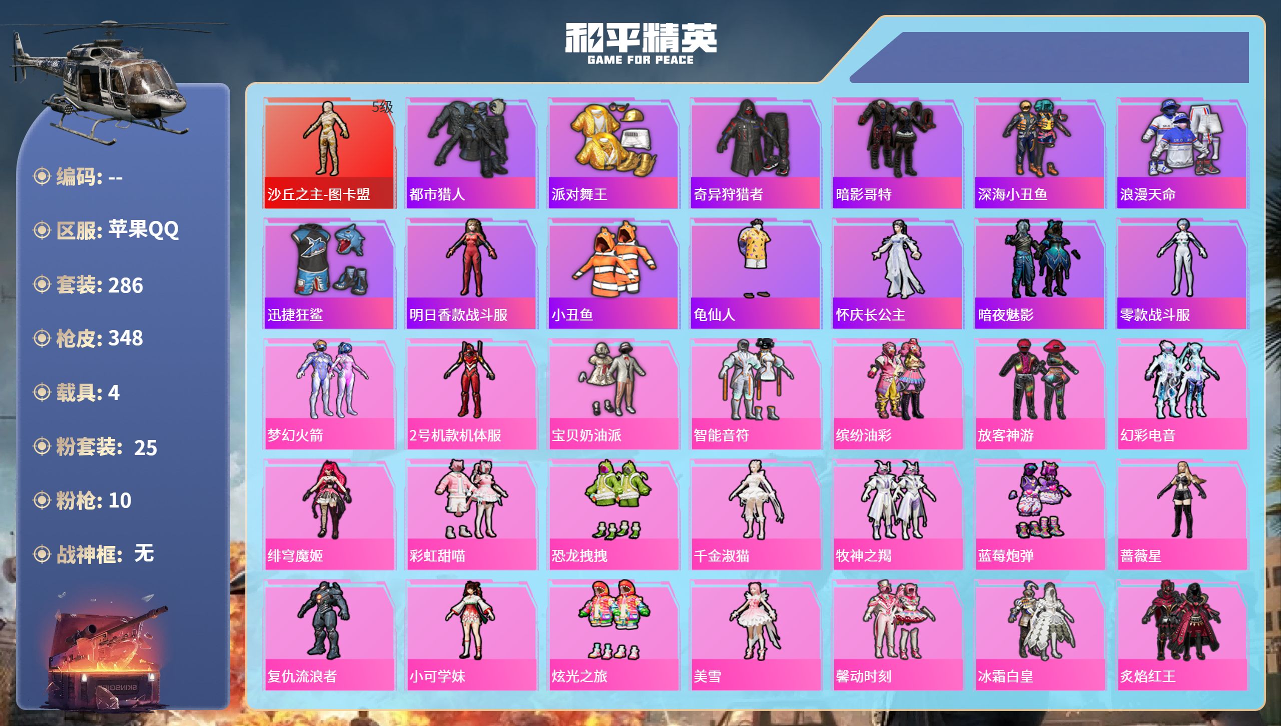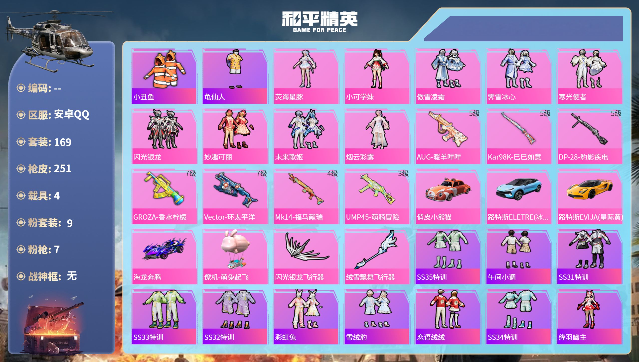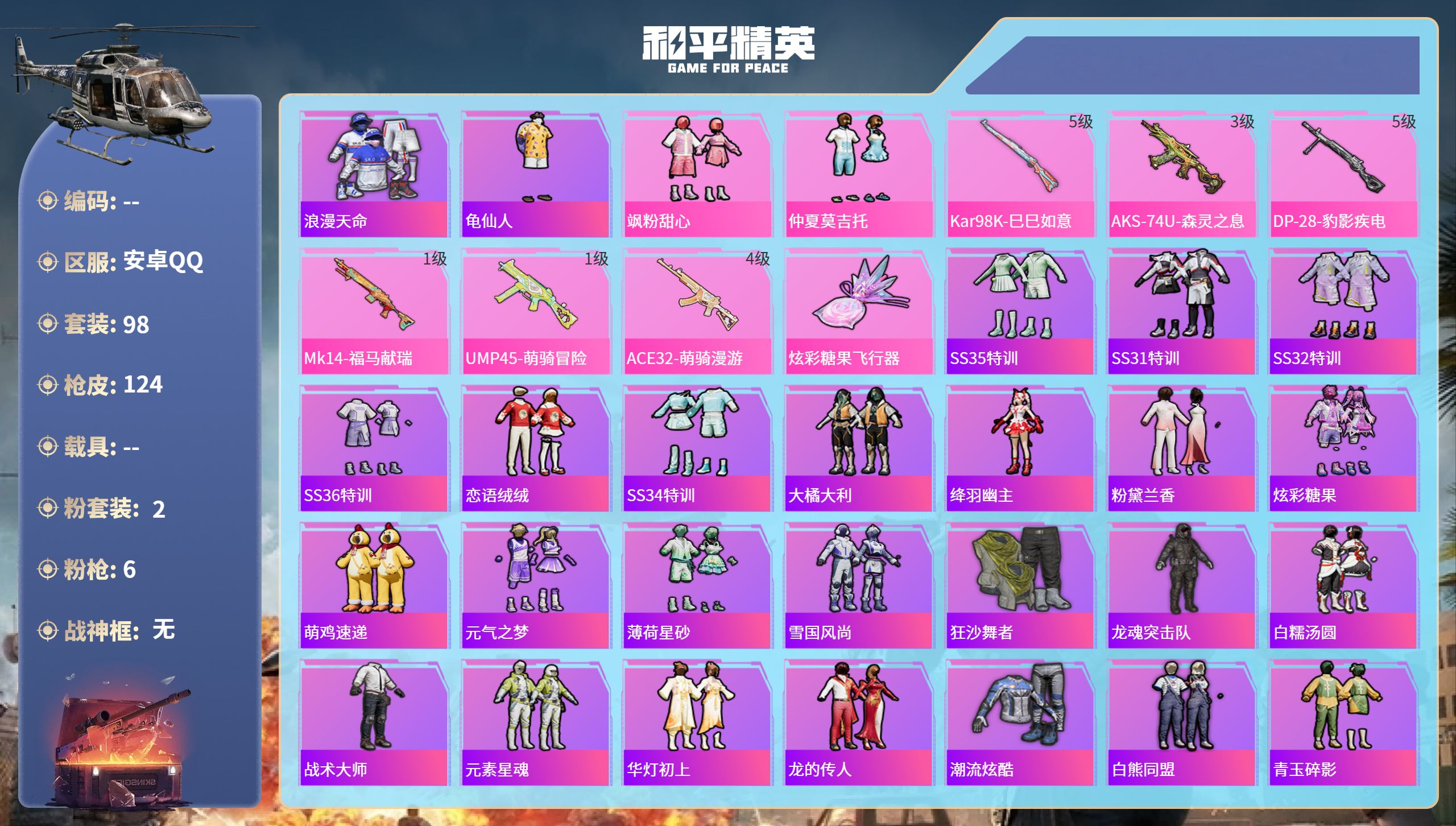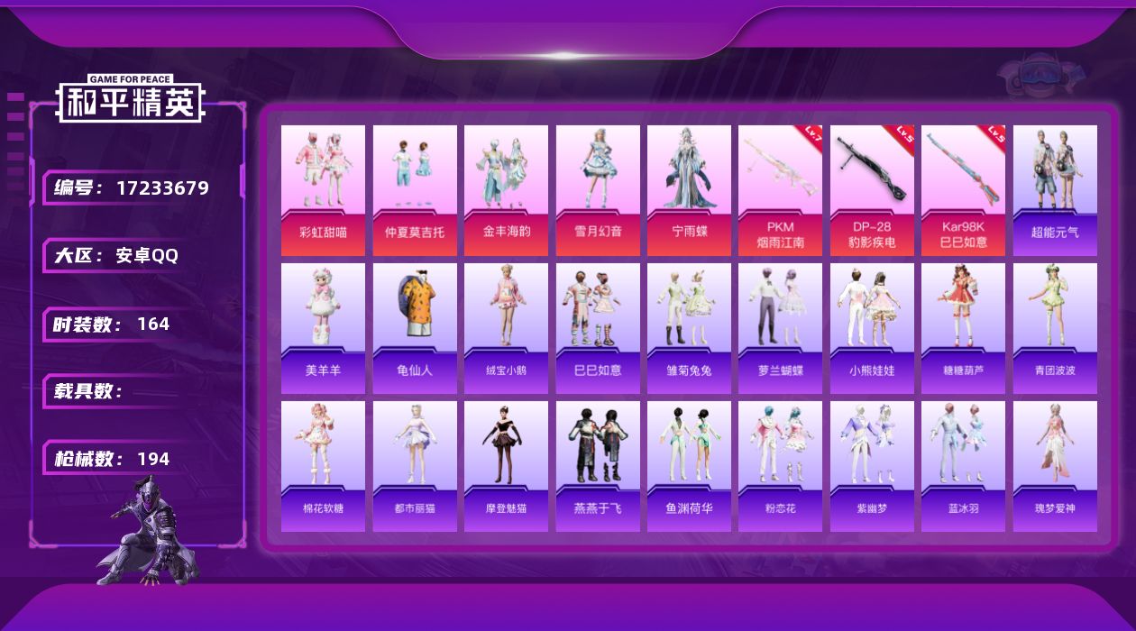 3粉装-3特效枪-1载具-2粉色飞行器-5·3w热力值-10王牌印记-149套装-170枪皮
