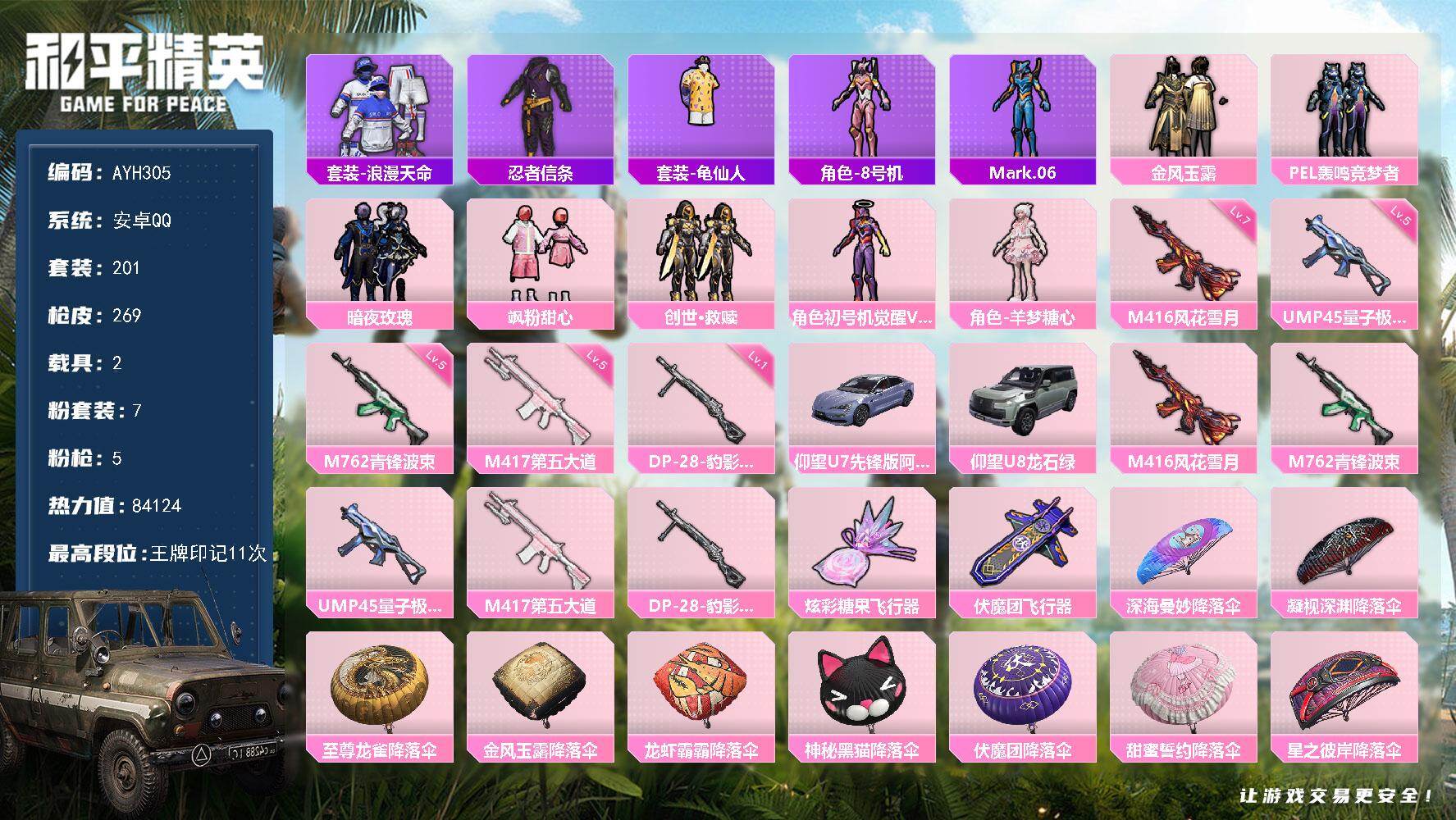 7粉装-5特效枪-2载具-2粉色飞行器-84124热力值-11王牌印记-201套装-269枪皮