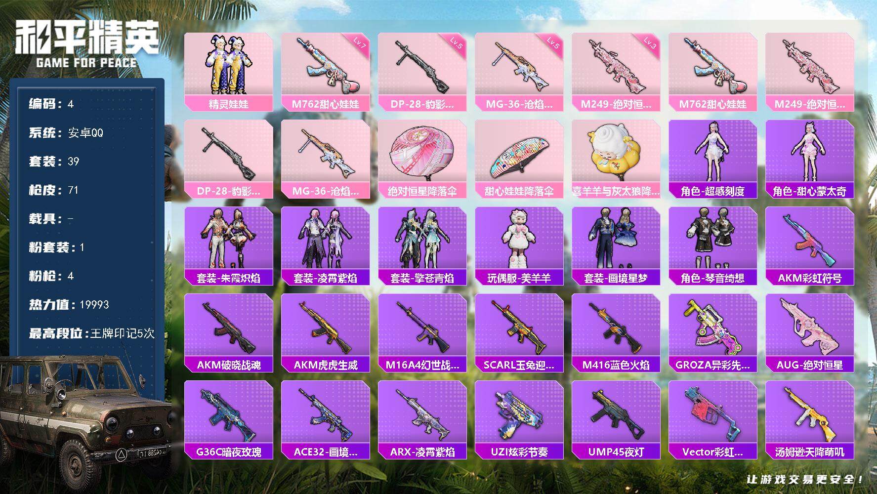1粉装-4特效枪-0载具-1粉色飞行器-19993热力值-5王牌印记-39套装-71枪皮