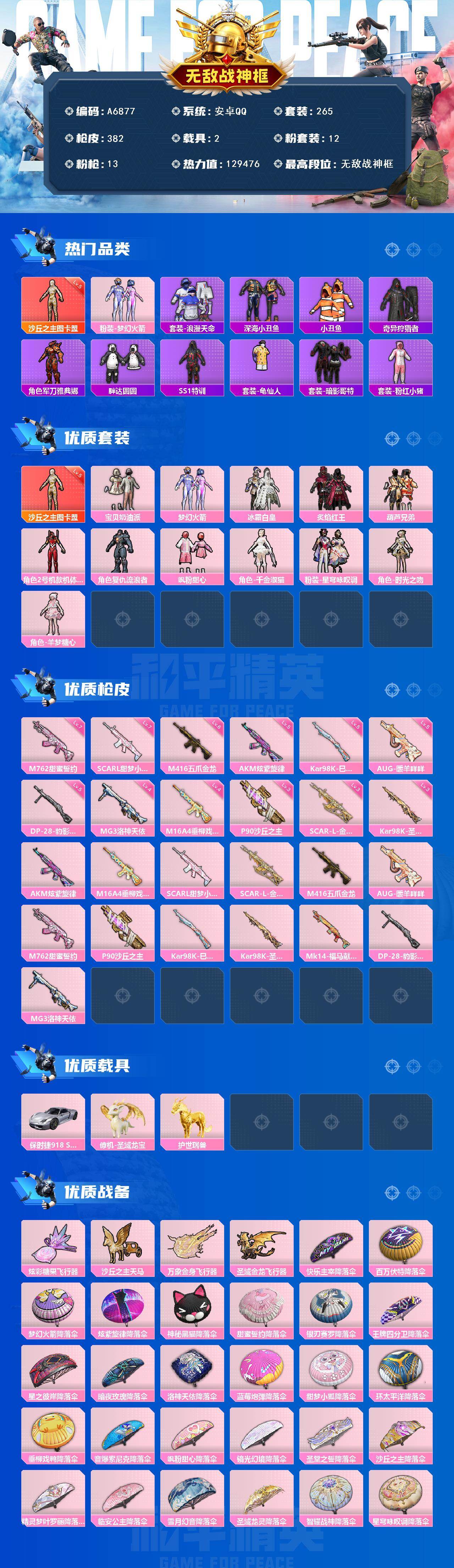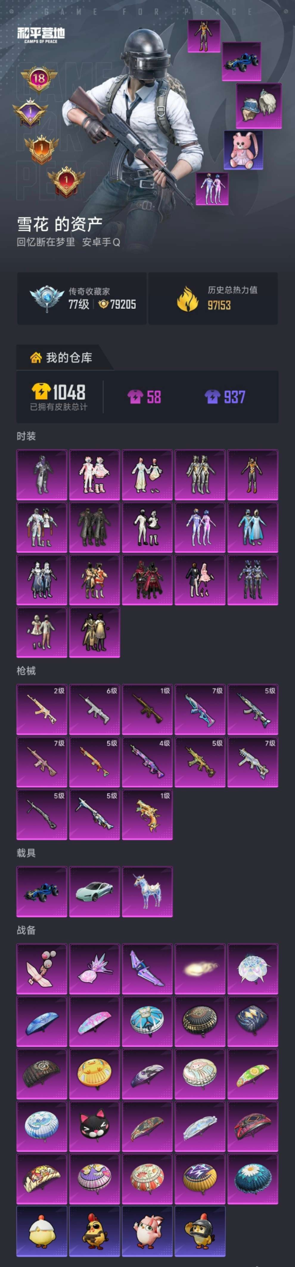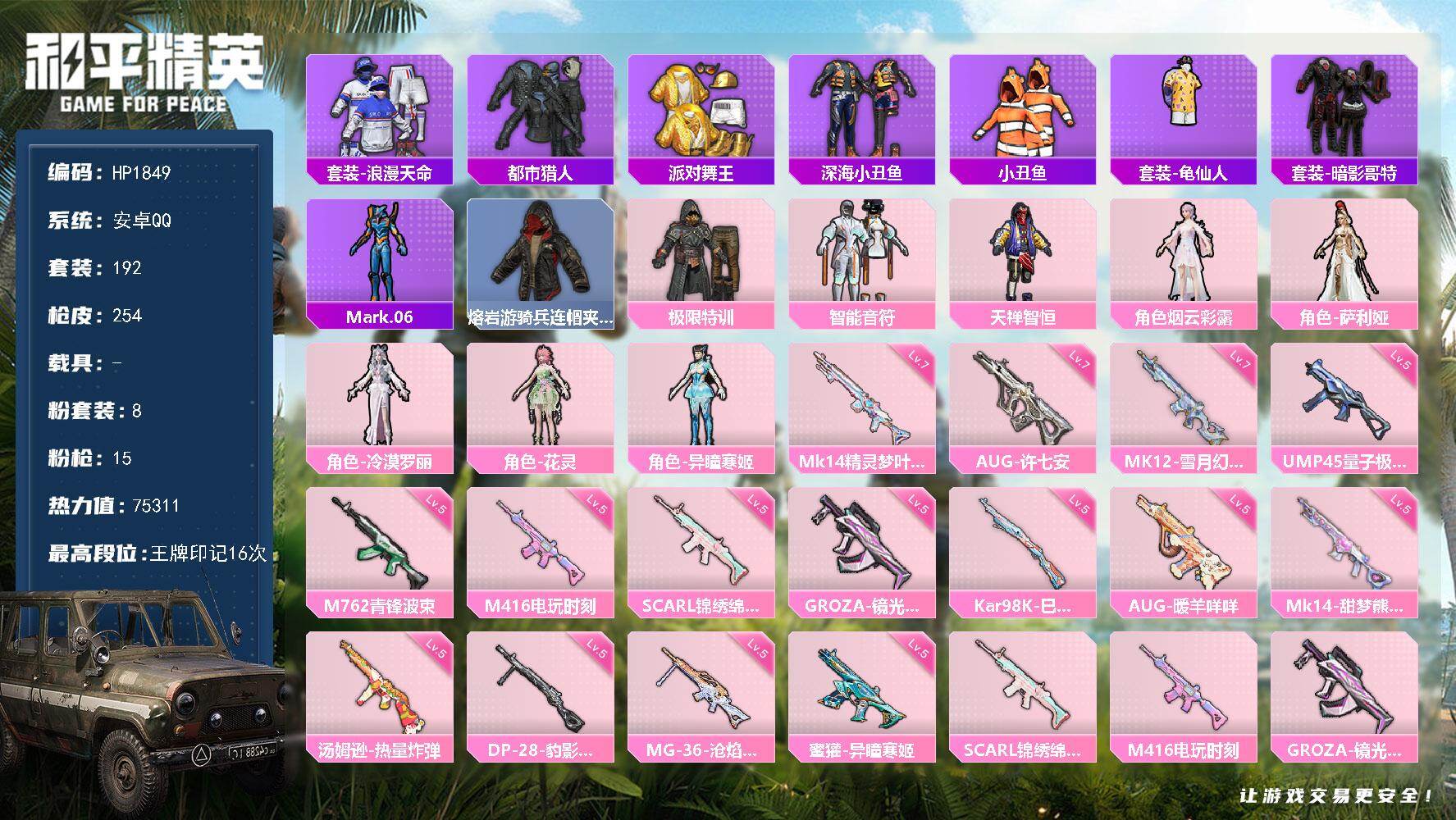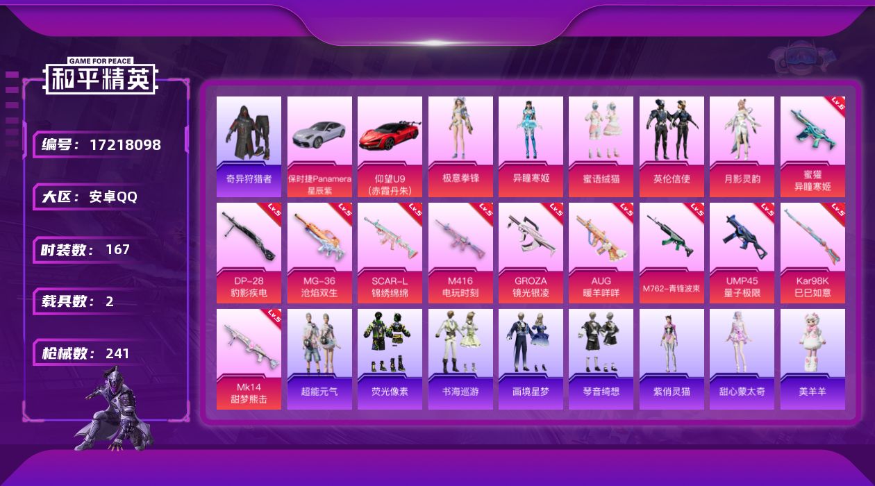 hs61340 安卓手Q-10王牌印记-1红装-5粉装-9特效枪-1载具-59571热力值-135套