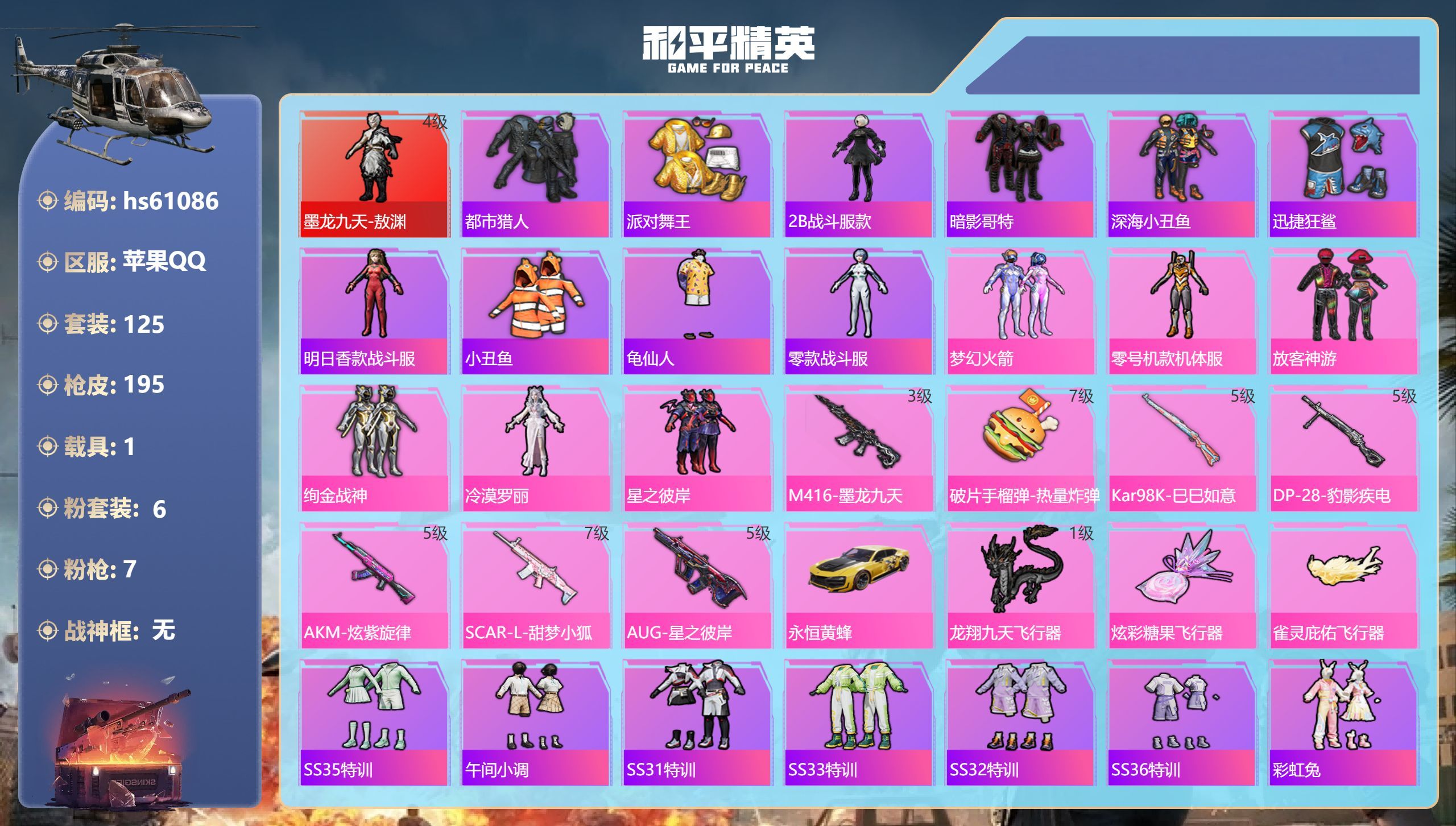 hs61086 苹果手Q-12王牌印记-1红装-6粉装-7特效枪-1载具-62478热力值-125套