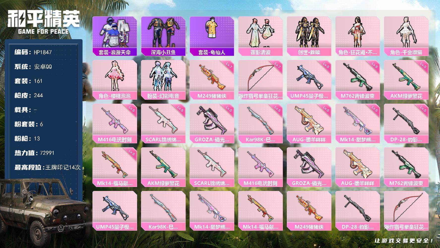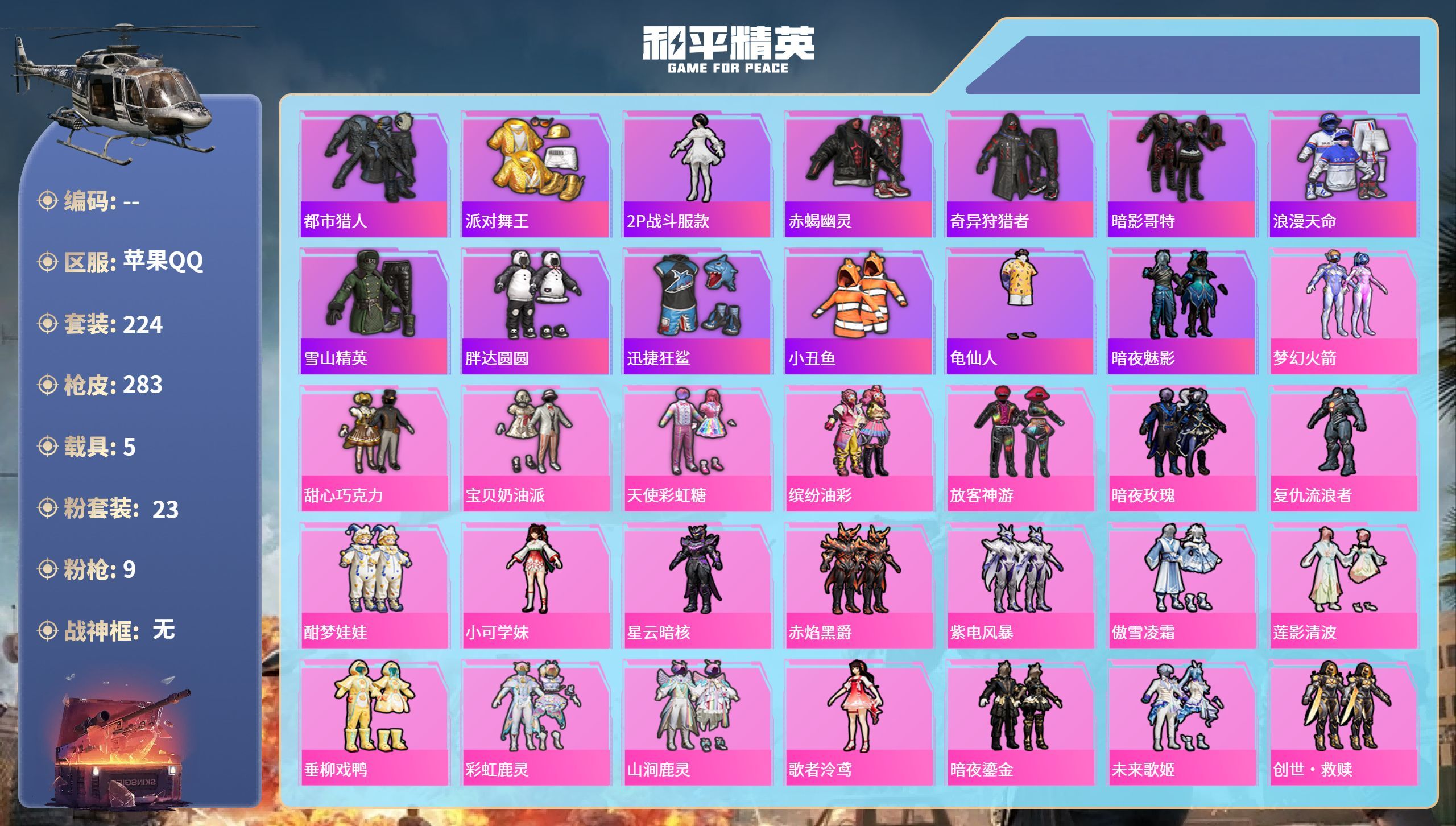hs39067 苹果手Q-10王牌印记-23粉装-9特效枪-5载具-108557热力值-224套装-