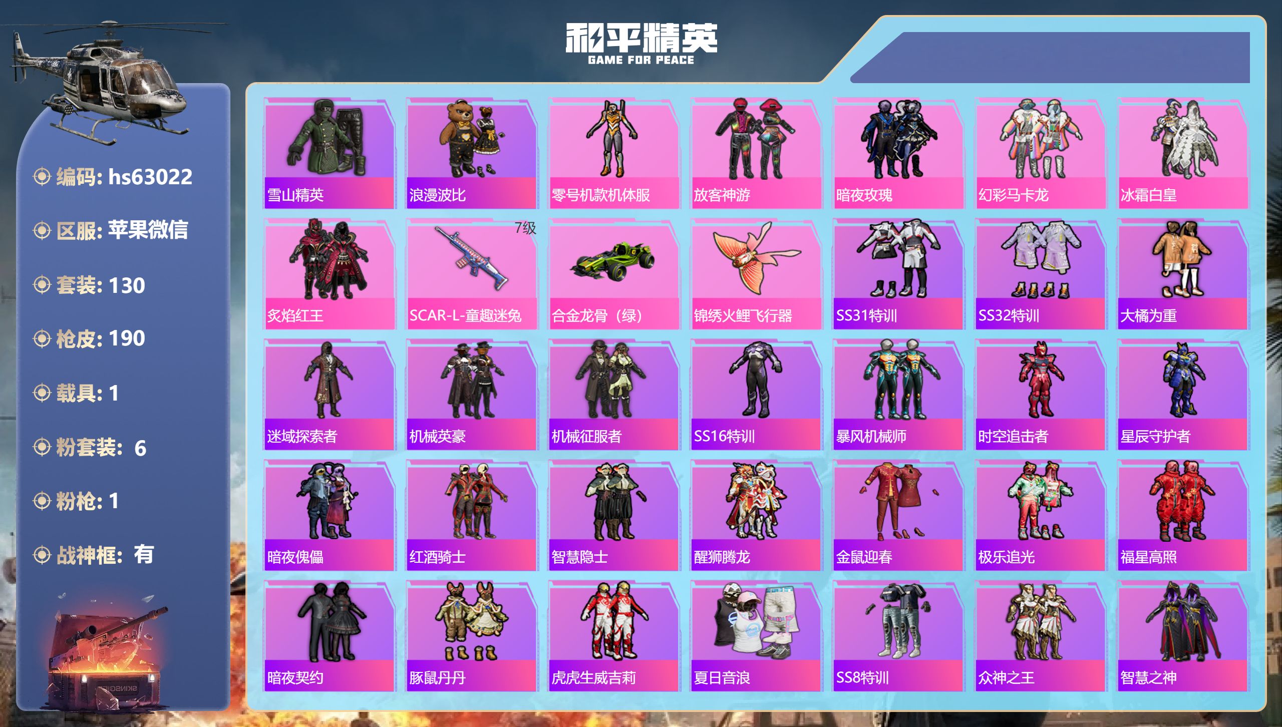 -2神装-25粉装-22特效枪-7载具-16粉色飞行器-123632热力值-15王牌印记-216套装-320枪皮