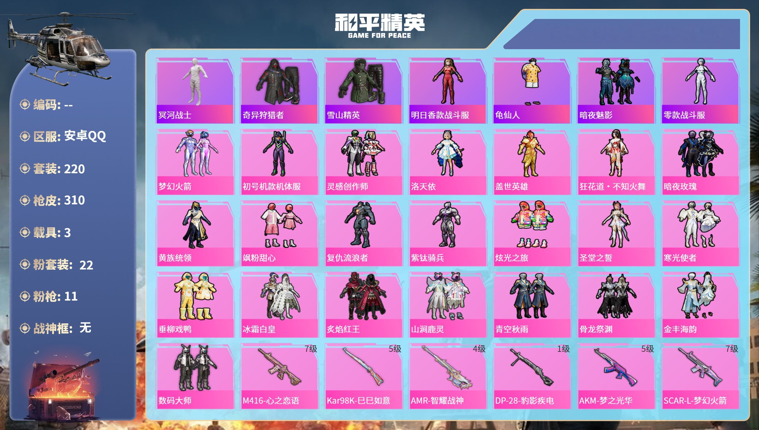 hs39068 安卓手Q-14王牌印记-22粉装-11特效枪-3载具-109696热力值-220套装
