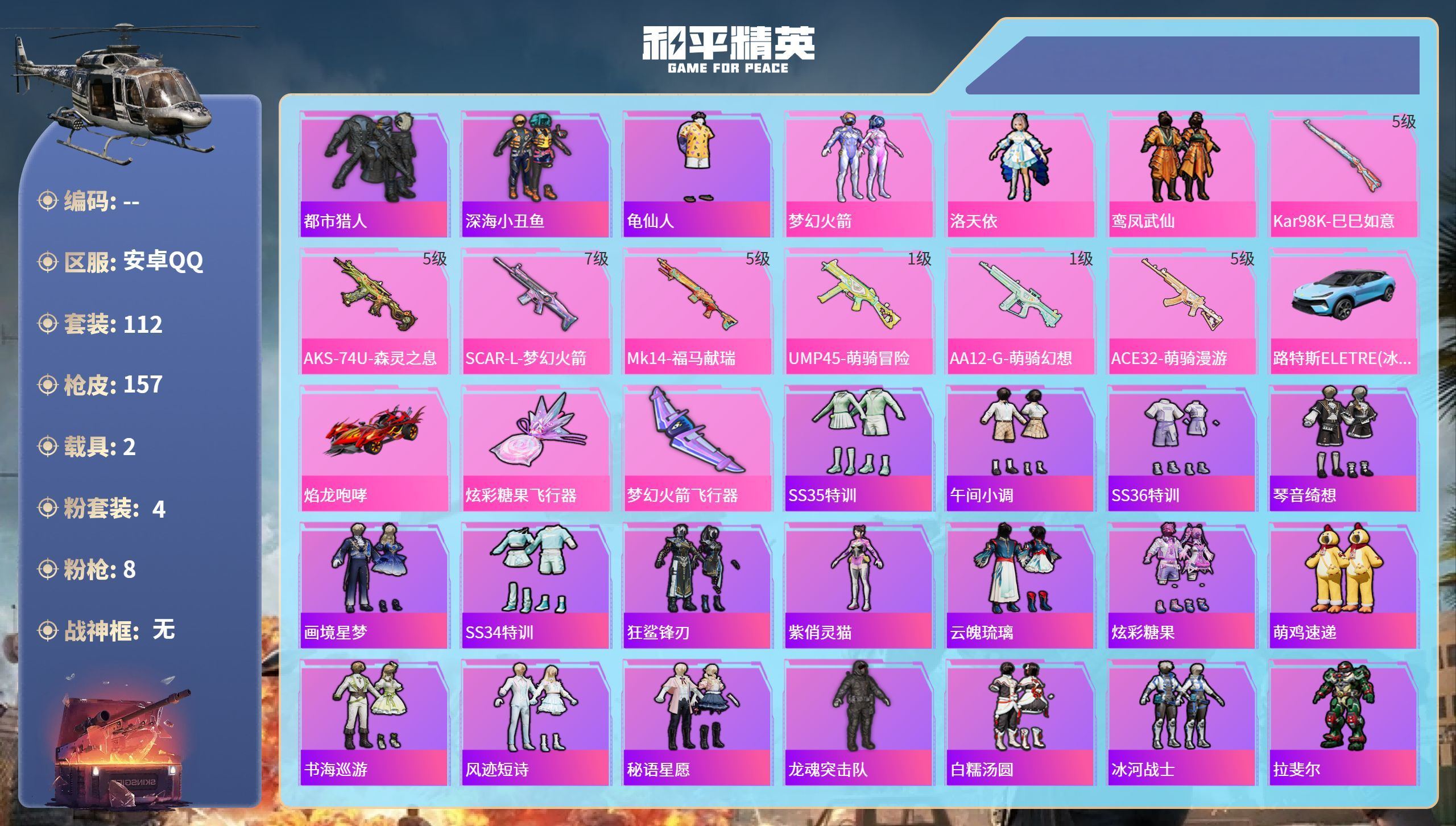 10粉装-5特效枪-2载具-2粉色飞行器-39609热力值-1王牌印记-71套装-93枪皮