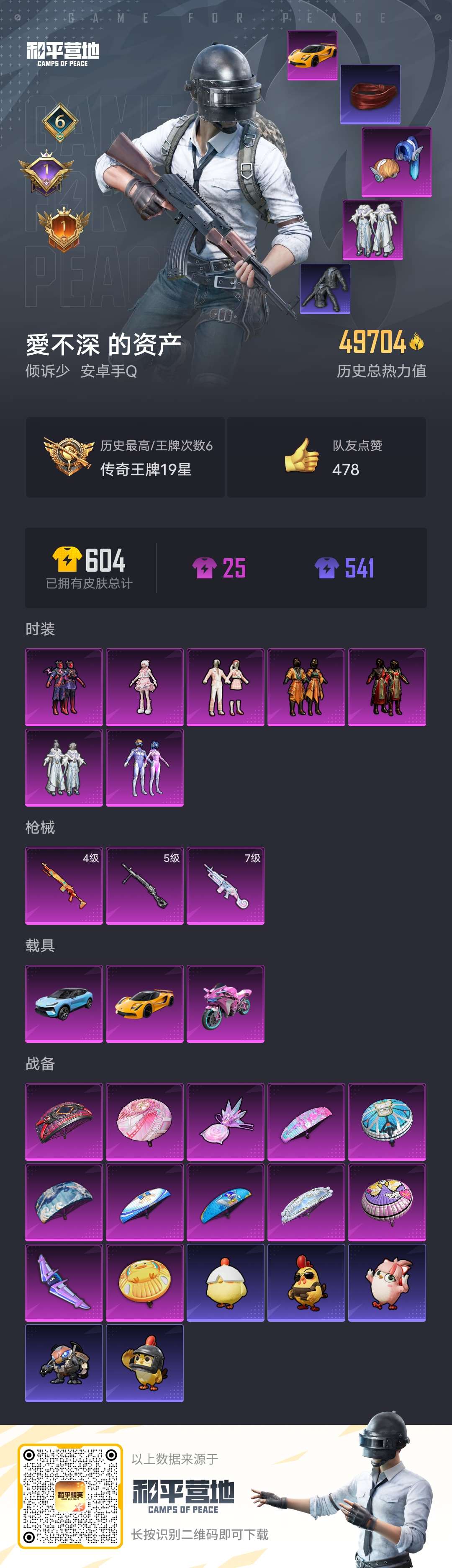 历史总热力值:69640 红装数量:3 粉装数量:7 特效枪数量:20 载具数量:3 王牌印记:4 历史最高段位:超级王牌5星 套装数量:81 时装数量:297 枪械数量:196 战备数量:123 装备数量:243