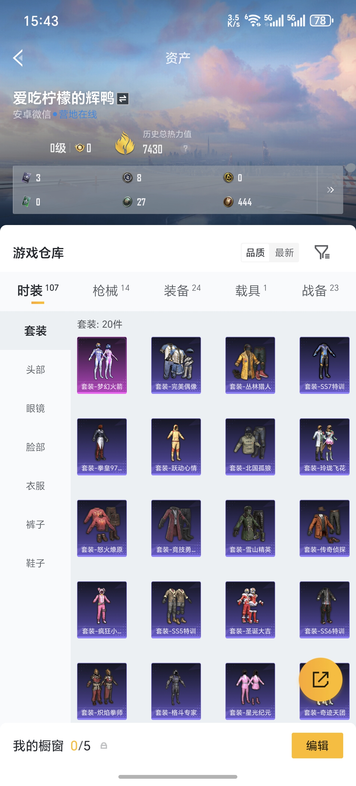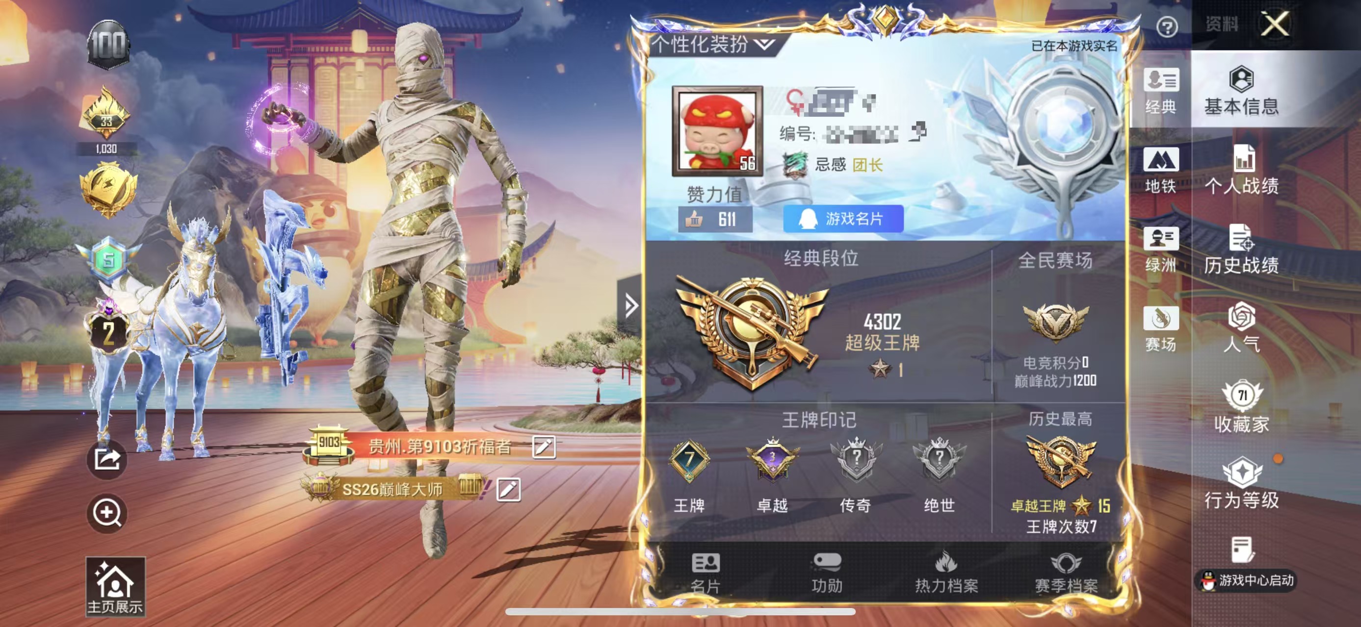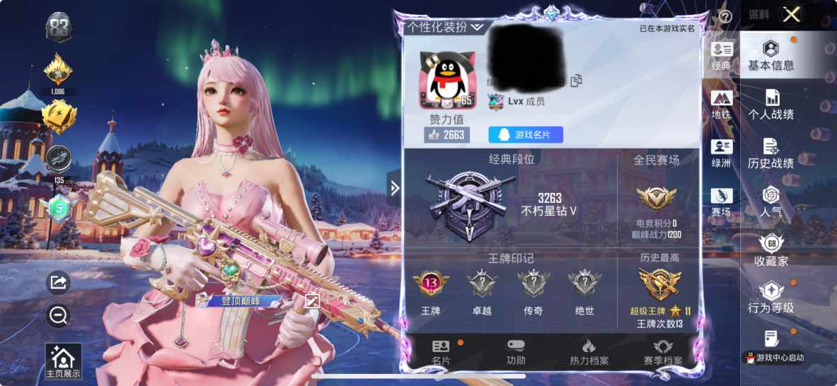 历史总热力值:91413 粉装数量:6 特效枪数量:16 载具数量:2 王牌印记:9 历史最高段位:卓越王牌7星 套装数量:173 时装数量:637 枪械数量:272 战备数量:192 装备数量:374