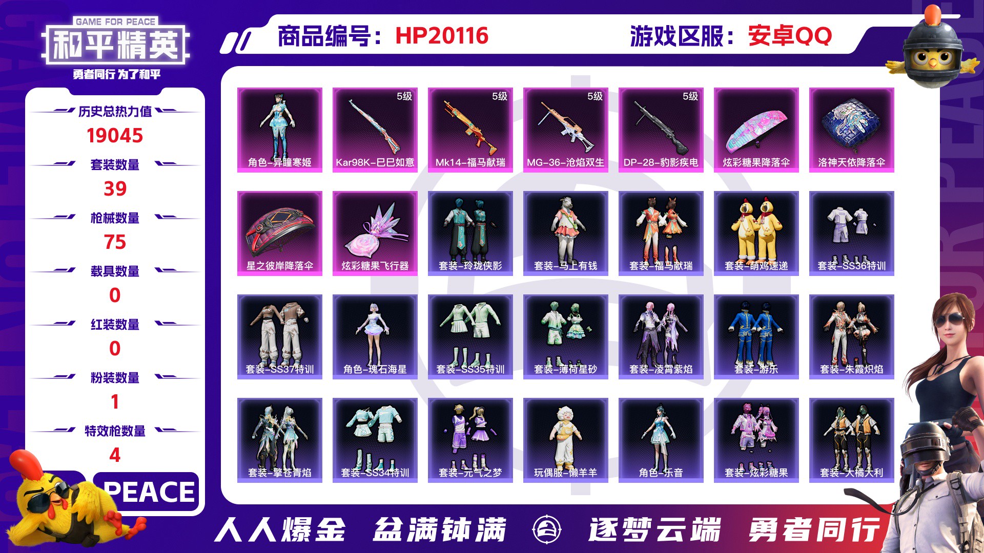 历史总热力值:19045 粉装数量:1 特效枪数量:4 历史最高段位:不朽星钻Ⅱ 套装数量:39 时装数量:159 枪械数量:75 战备数量:47 装备数量:112
