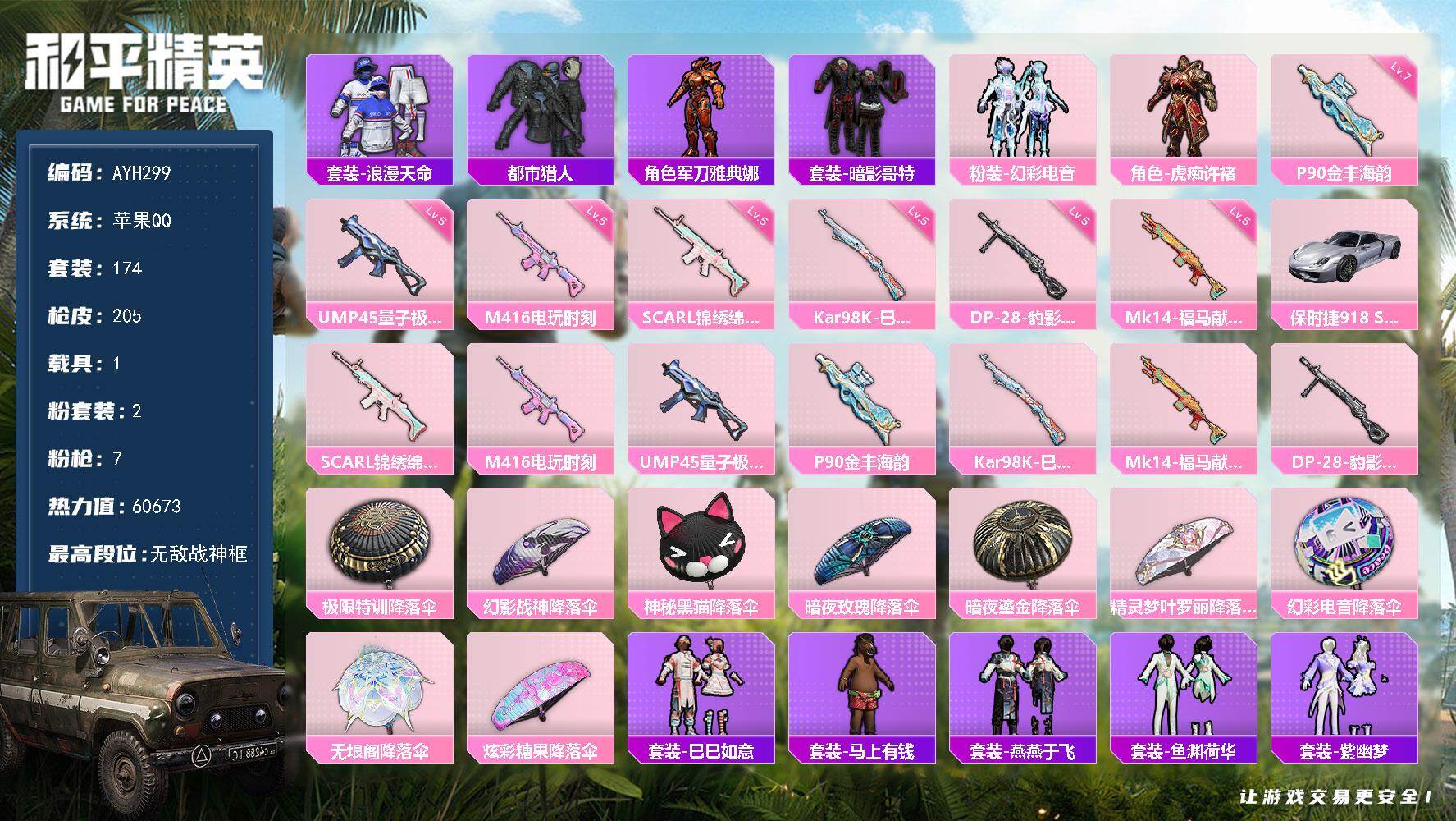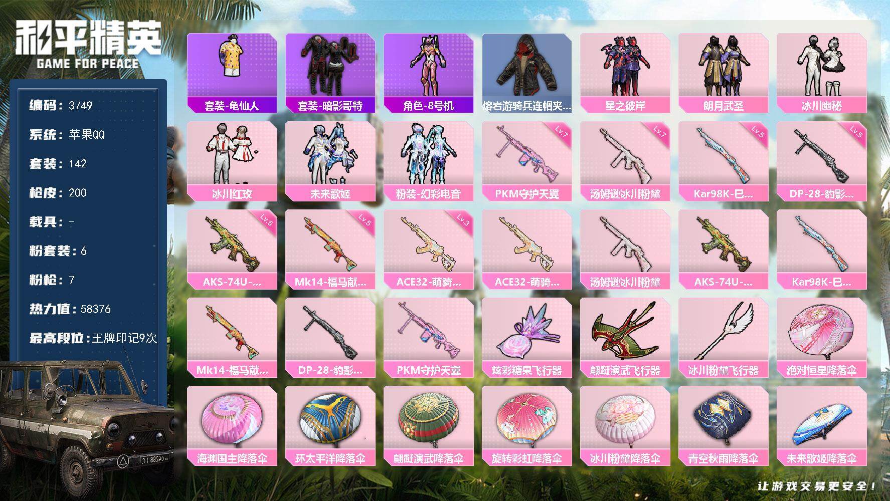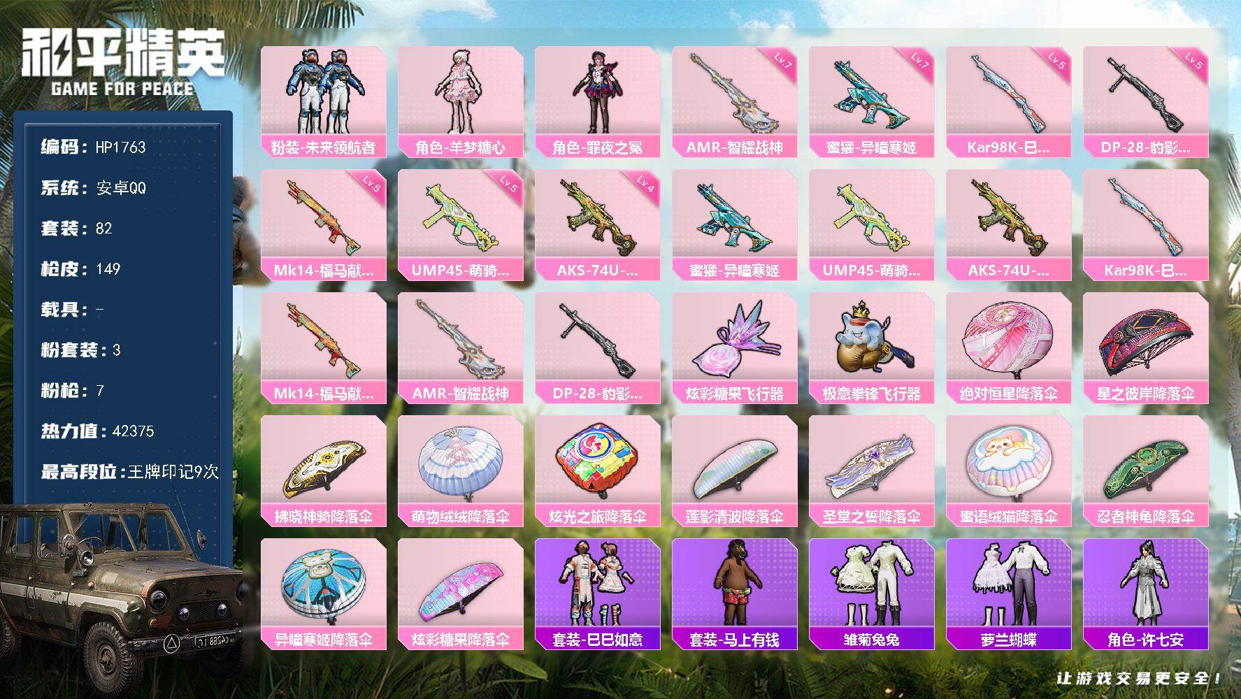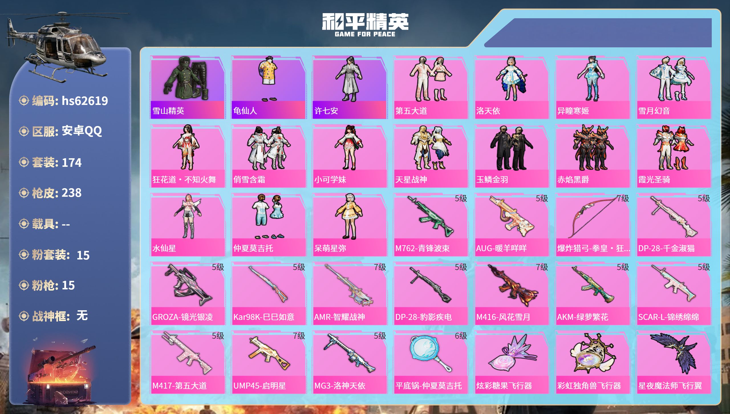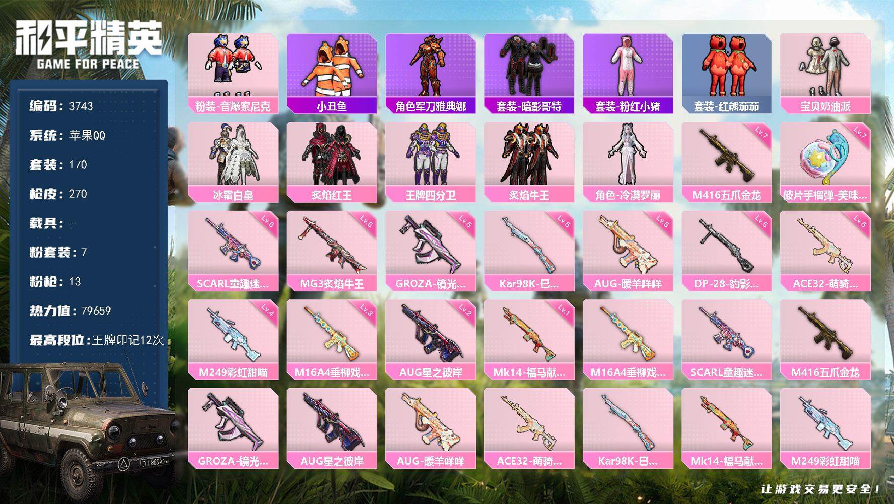 7粉装-13特效枪-0载具-3粉色飞行器-79659热力值-12王牌印记-170套装-270枪皮